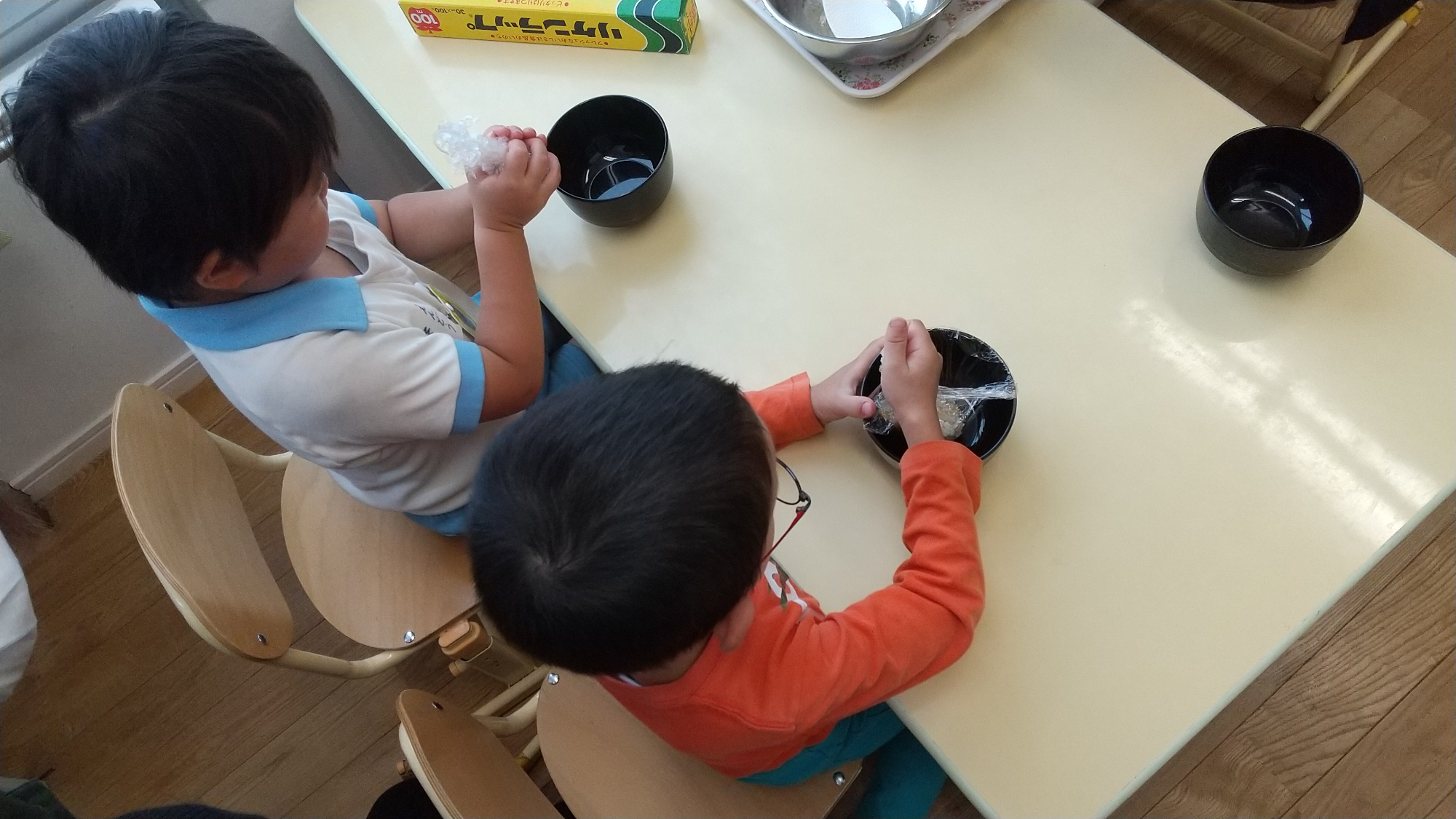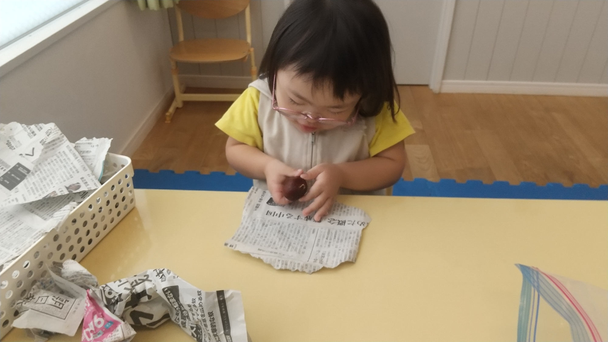 みんなで苦労して収穫した栗は、ルームに持ち帰り「栗ご飯」にして食べることにしました。新聞紙で包んだ栗を冷蔵庫で二週間ほど寝かせ、追熟するのを待ちます。途中で湿った新聞紙の交換も必要です。子どもたちは協力して、新聞紙の交換を行いました。栗全体を新聞紙で包むのは難しく、新聞紙を2枚使って包むなど工夫する姿が見られました。