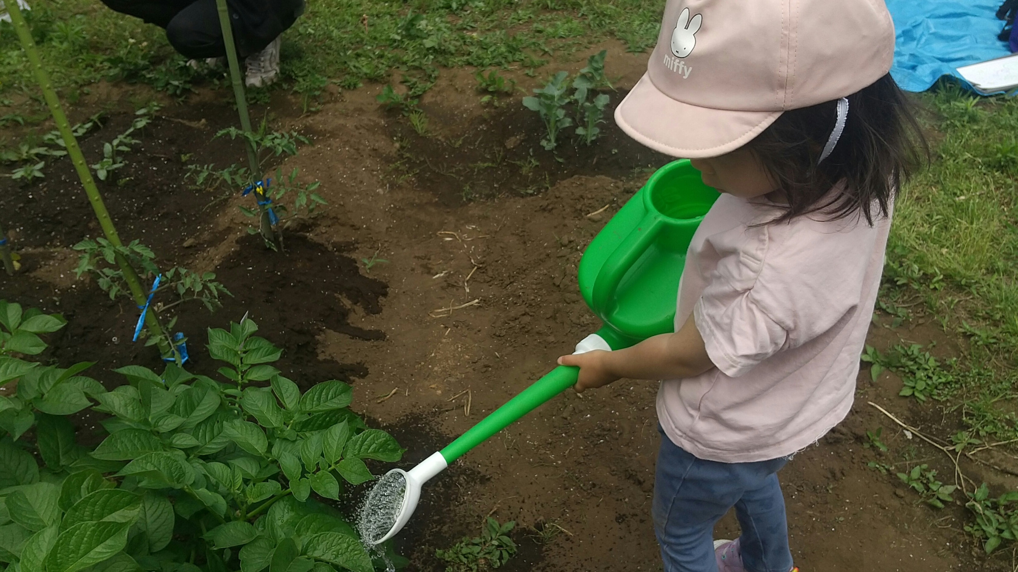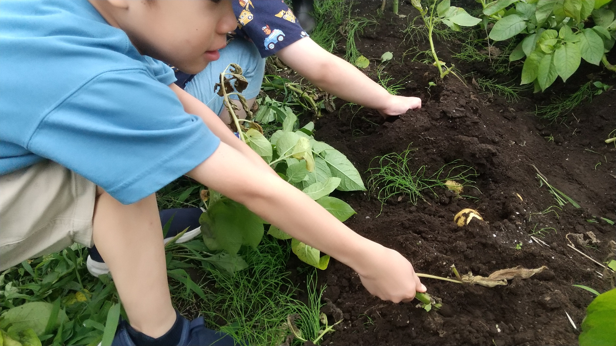 ジャガイモからできるものとして、フライドポテトやポテトチップスを連想する子も多く、みんな収穫して食べることを楽しみにしていました。4月から5月はジャガイモの水やりや、周辺の雑草抜きに取り組みました。また、育ってきて土から顔を出しているジャガイモが陽に当たらないよう、土をかぶせる作業も行いました。