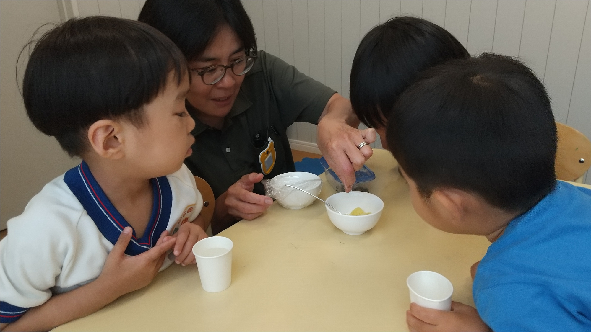 ジャガイモはシンプルに、レンジで温めてから塩で味わいました。アツアツのジャガイモをスタッフが取り分ける様子を、みんな待ち遠しそうに見つめていました。ジャガイモに塩をかけ過ぎてしょっぱくなった子もいましたが、おかわりの際は慎重に塩をつまんでかけることができました。