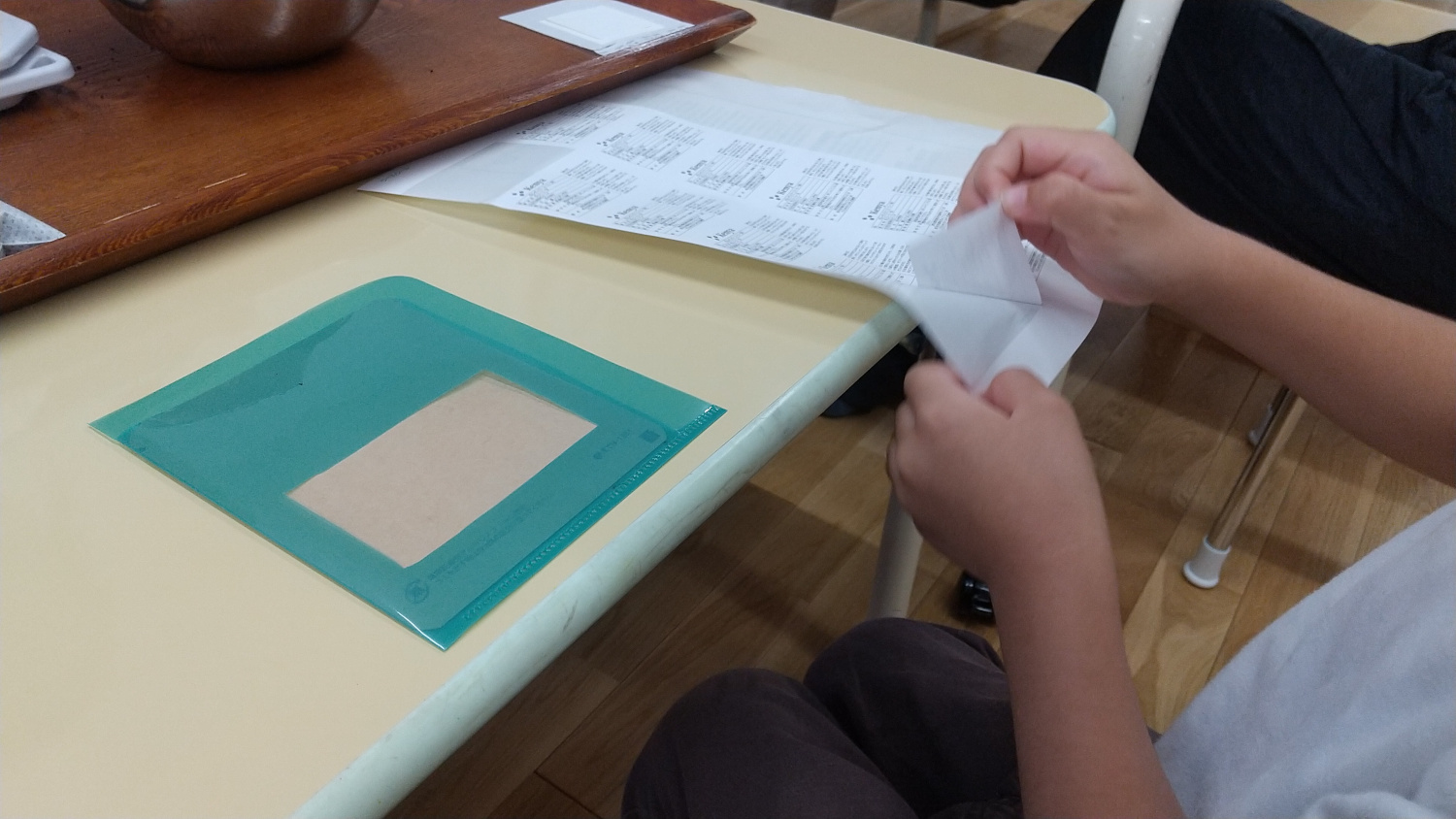 途中で「疲れた」と弱音がこぼれることもありましたが、肩を回したり深呼吸をしたりしながら最後まで丁寧に作業を頑張りました。隣で黙々と仕事に取り組む利用者の方が手本になっているように感じました。子どもたちの仕事体験が終わり、つむぎ 武蔵野ルームのスタッフに「すごくきれいに貼れたね」「これならお店で売るものも作れそうだね」と言葉をかけられ、少し照れながらもとても嬉しそうにしていました。