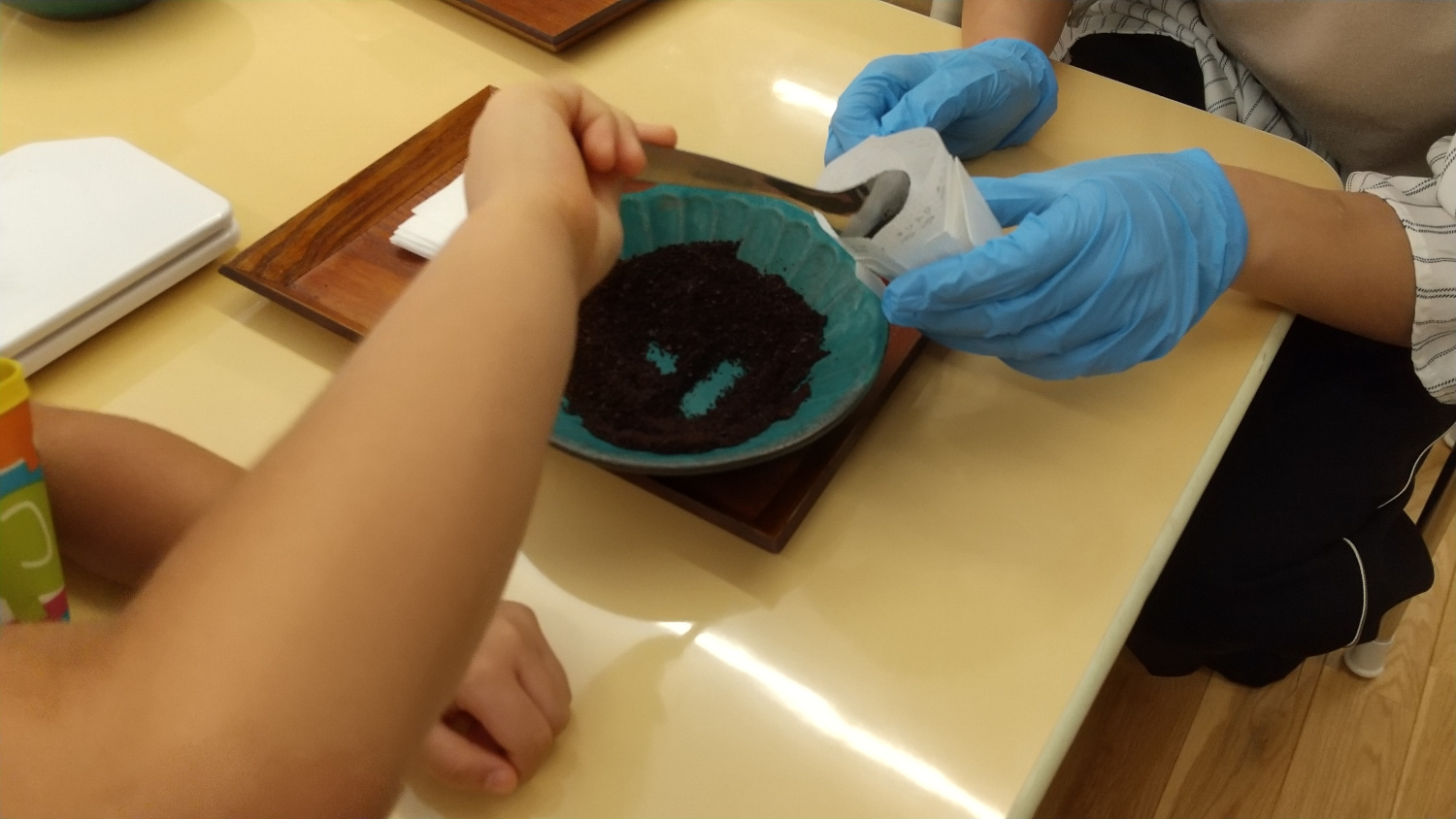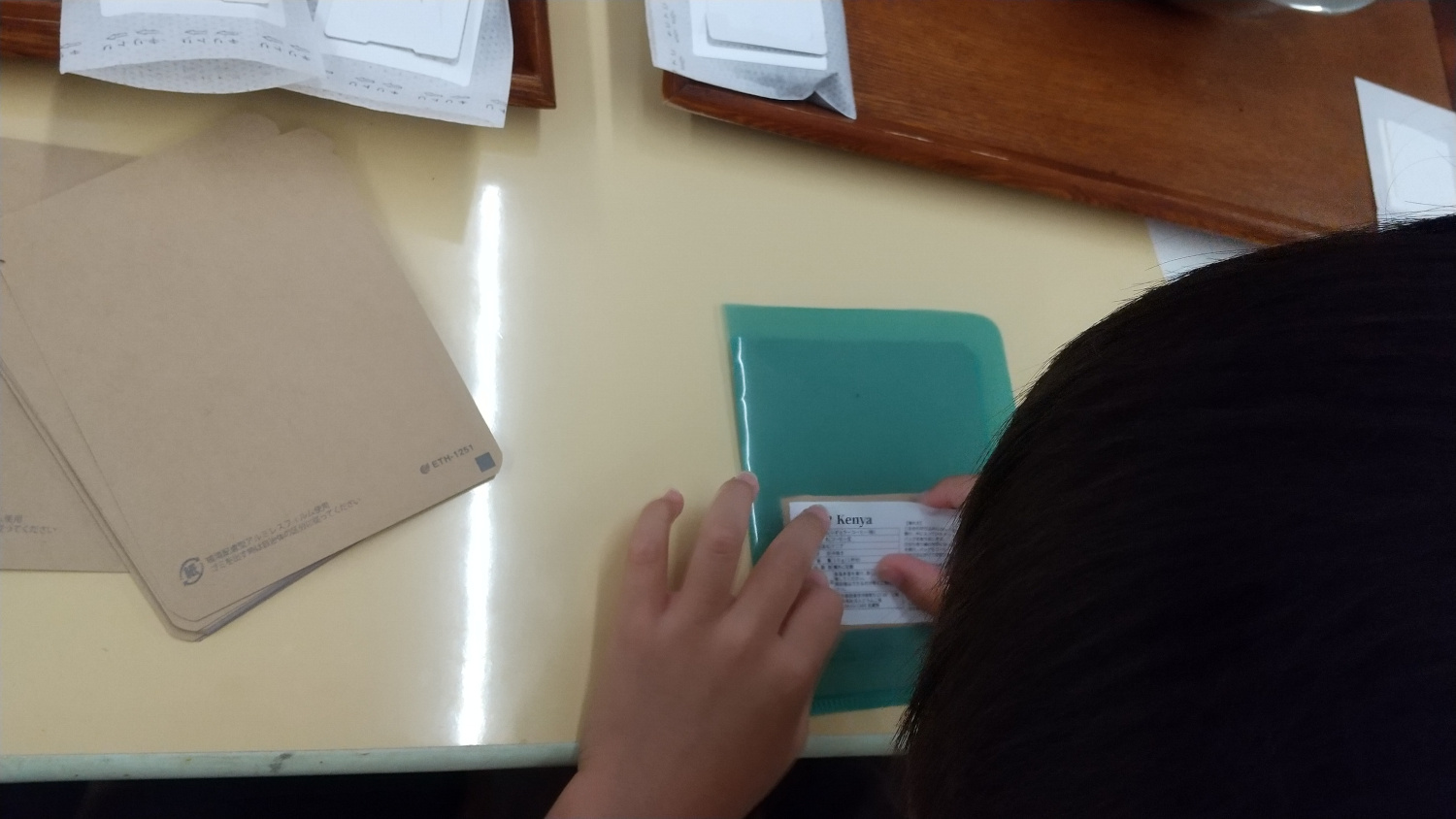 最初は、入れすぎたり、少なすぎたりとなかなか数字をピッタリ合わせることができず苦労した子どもたちですが、利用者の方に丁寧に教えてもらったり助けてもらいながら、何度も繰り返し挑戦しドリップバッグを完成させていました。