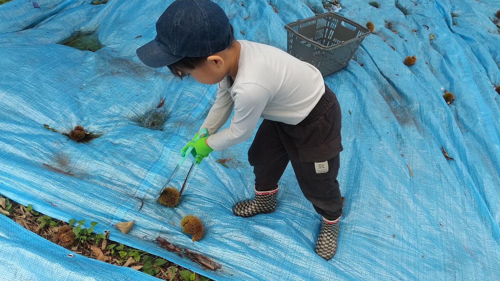 子どもたちは就労支援の利用者の方と一緒になって、同じように大人用の道具を使いながら、どこに力を入れてどのように持てば栗を拾えるのか、試行錯誤する場面がありました。最初は中々うまく拾えない栗も、次第にコツをつかむことが出来て、2つ同時に拾おうとするなどの様子が見られるようになりました。
