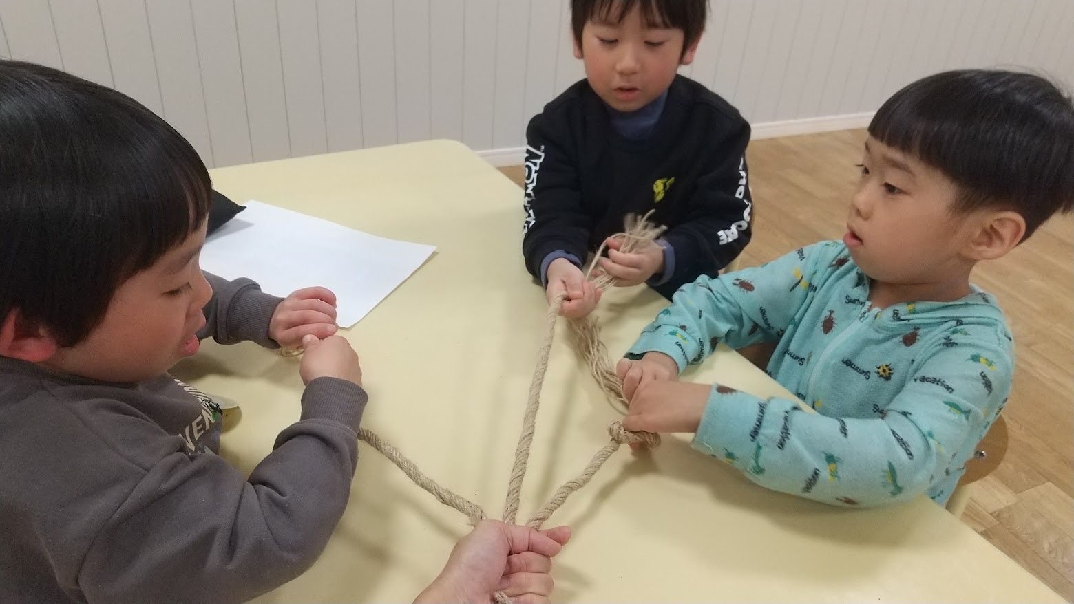 5歳児の3人は、協力して1つのしめ縄を作ることに挑戦しました。最初は「2人だけの力で、できるんじゃない?」と言う子どももいましたが、いざ始めてみると、ほどけないように麻ひもをねじることに、予想以上の難しさを感じているようでした。また周りの友だちの様子と見比べ、自分のねじった向きが逆ということに気付き、最初からやり直す姿もみられました。