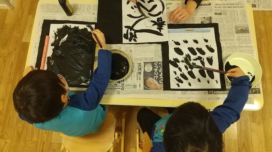 半紙を墨で真っ黒に染めることや、筆をスタンプのようにする等、思い思いに書初めを楽しんでいました。文字に興味がある子は、「あけましておめでとうございます」と書いたり、漢字を書くことに挑戦したりしていました。