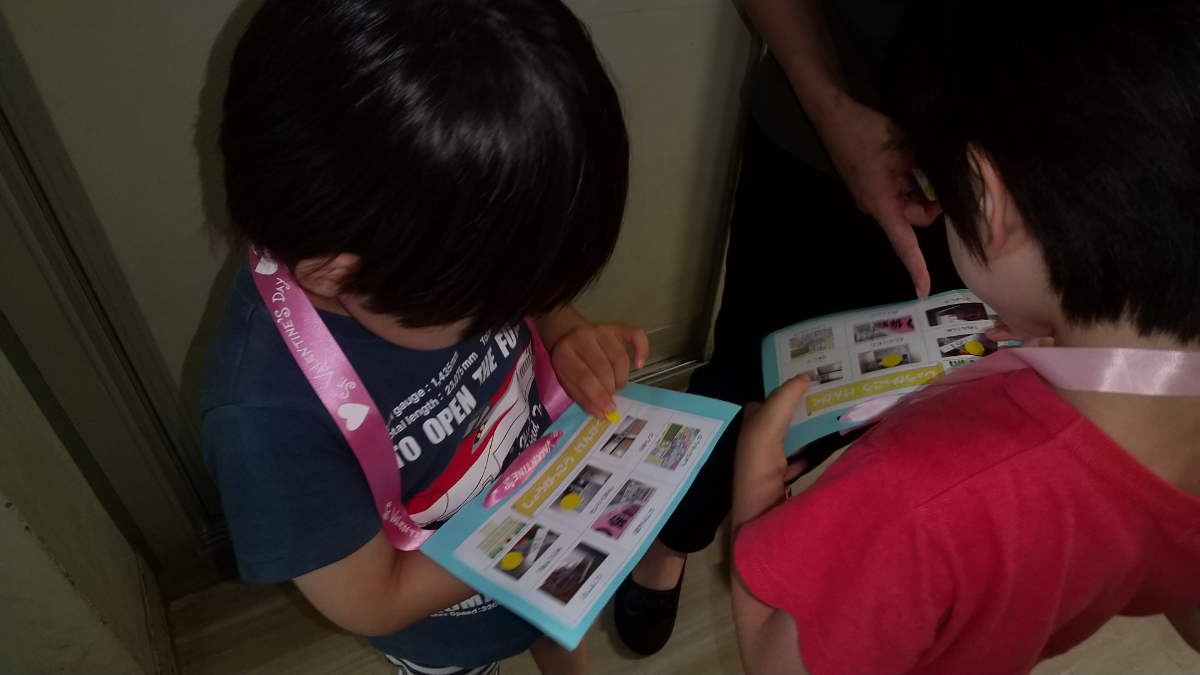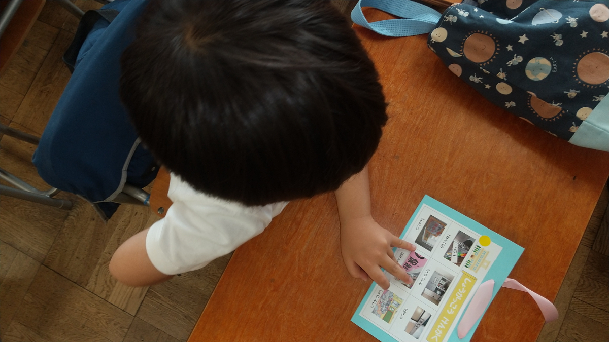子どもたちは教室の名前が書かれたビンゴカードを持ち、小学校の先生に案内してもらいながら校内を巡りました。ビンゴカードには「理科室」「保健室」「体育館」等、室名札の写真が載っています。年中児が写真を見ながら「この理科室ってどこに書いてあるの?」と、教室の中をキョロキョロ探していました。すると年長児が「外にあるんだよ」「上の方だよ」と廊下に出て教えてあげる場面もありました。