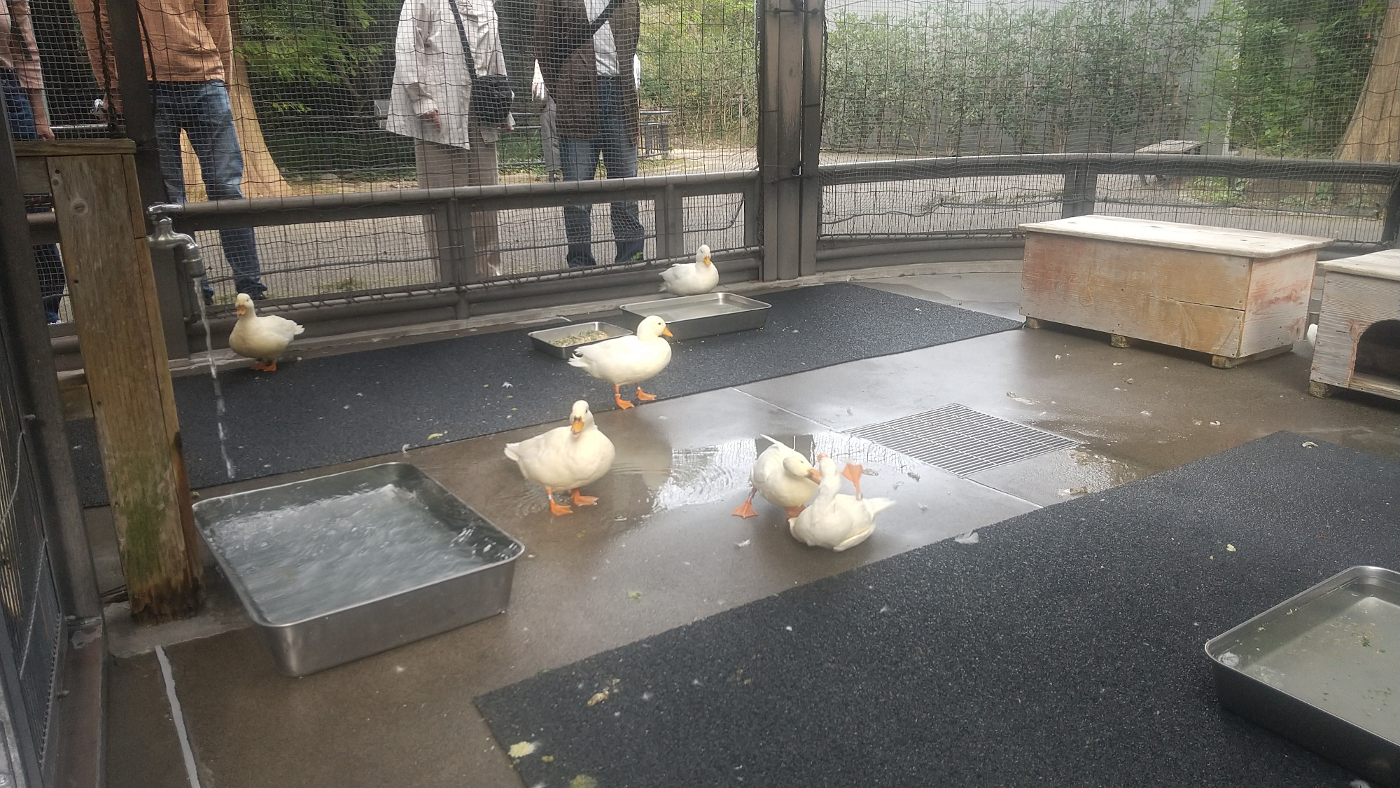 当日はお互いに自己紹介し、始めにコールダックというあひるの見学に向かいました。「ガーガー」と激しい鳴き声が聞こえ、子どもたちは「なんだろう」「すごく鳴いているね」と言いながらケージをのぞくと、複数いる中の1匹がもう1匹のおなかにくちばしを激しくつつく様子が見られました。