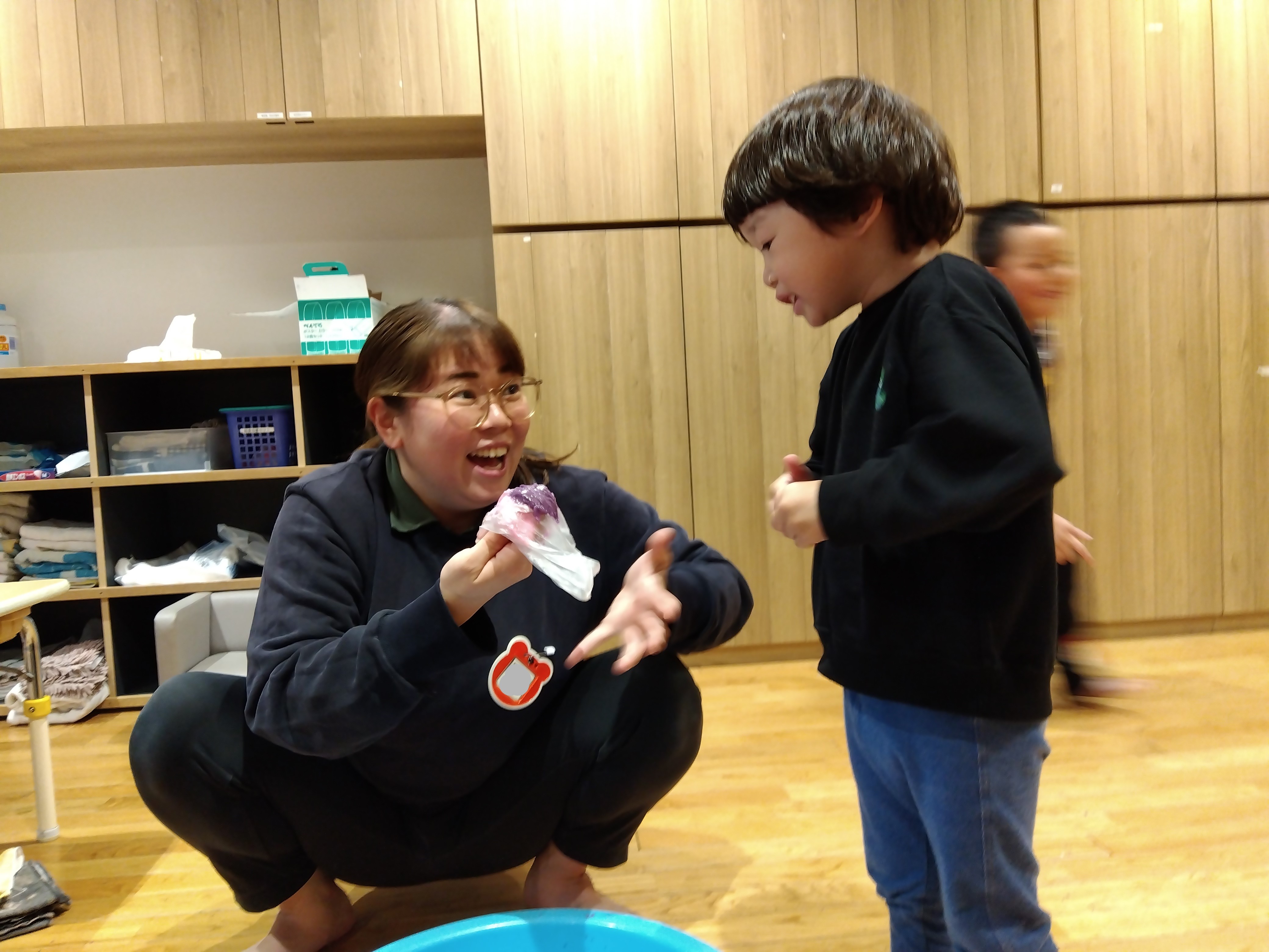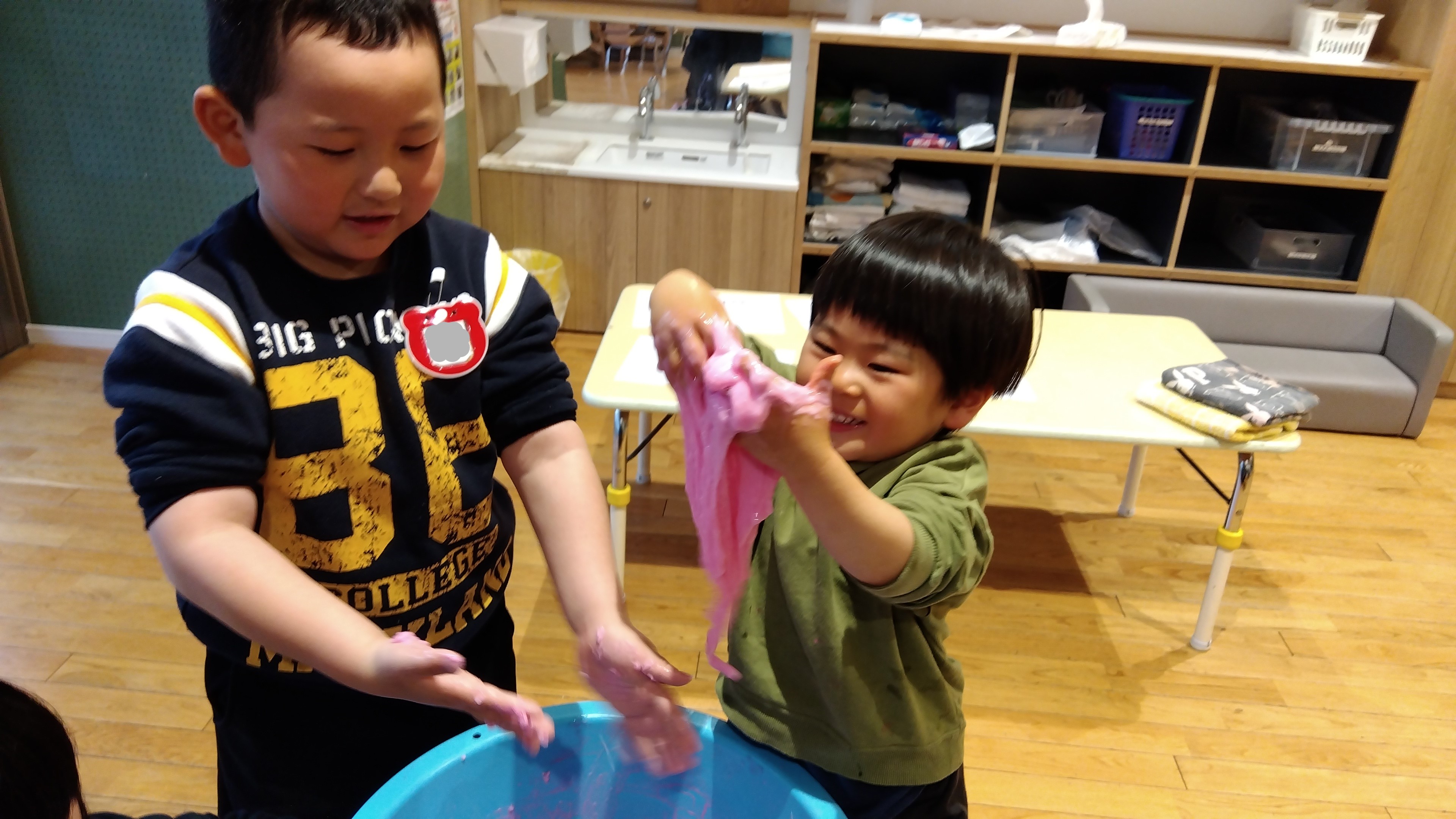 スライム遊びでは、自分たちでスライムを作るところから始めました。役割分担決めでは自分の気持ちだけでなく、友だちの気持ちもスタッフと一緒に考えながら話し合いを行い、スライムが出来上がると子どもたちは大喜びで感触遊びを楽しむことが出来ました。粘土道具で形を変えてみたり、スライムの上に座ってみたり、袋の上から触ってみたりと様々な遊び方を見つけました。