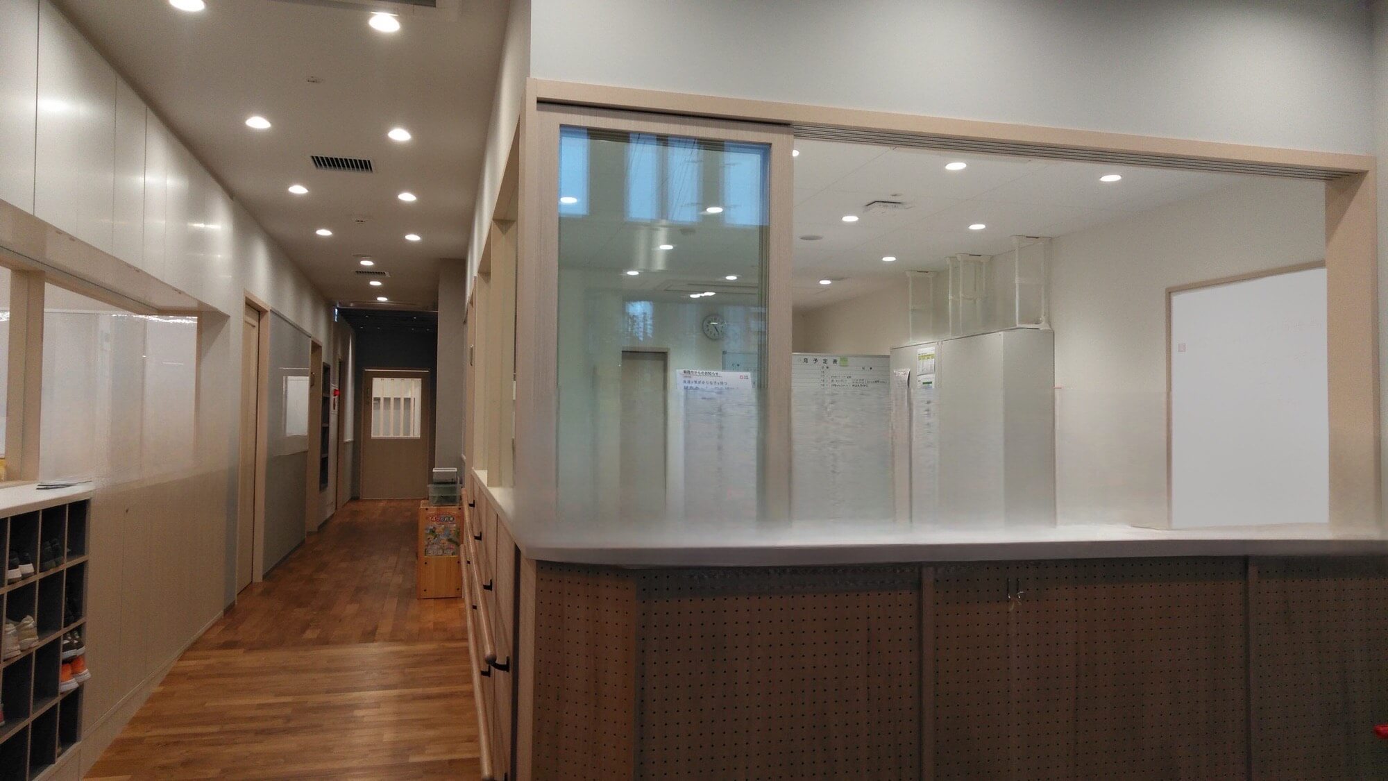中に入ると木のぬくもりを感じる廊下、ガラス張りの事務所と保育室が見えます。