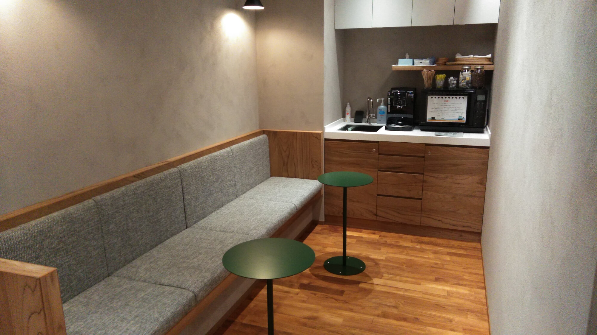 開放的な保育室を眺めながら奥に進むと、地域の方もご利用いただける「つむぎカフェ」があります。温かいコーヒーや紅茶を飲みながらほっと一息つけるようなスペースです。