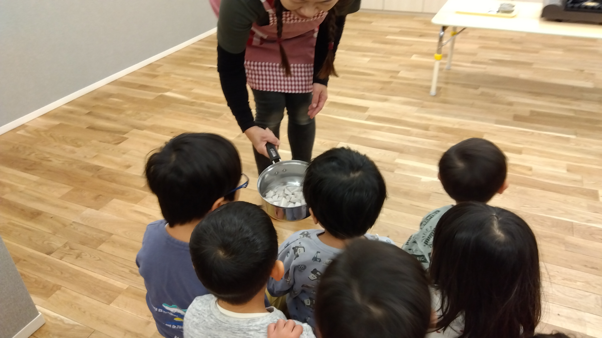鍋に入った里芋をコンロで火にかけると興味を持って近づいていきますが、危ないからと火から遠ざけるのではなく、「これなんだろう?」と子どもが関心を示したことを大切にして見守れるように意識しています。