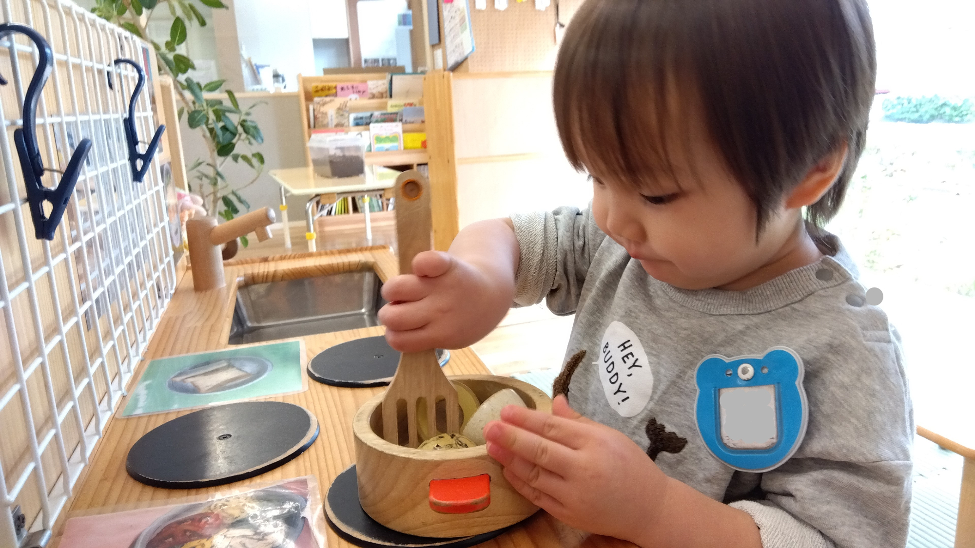 その後、ままごとコーナーに向かった子どもがいたので、職員が鍋を一つ用意して芋を見せながら、「お鍋に入れて料理したね」と、先ほどの食育についての言葉がけをすると、自ら「へら」を取り出し、
