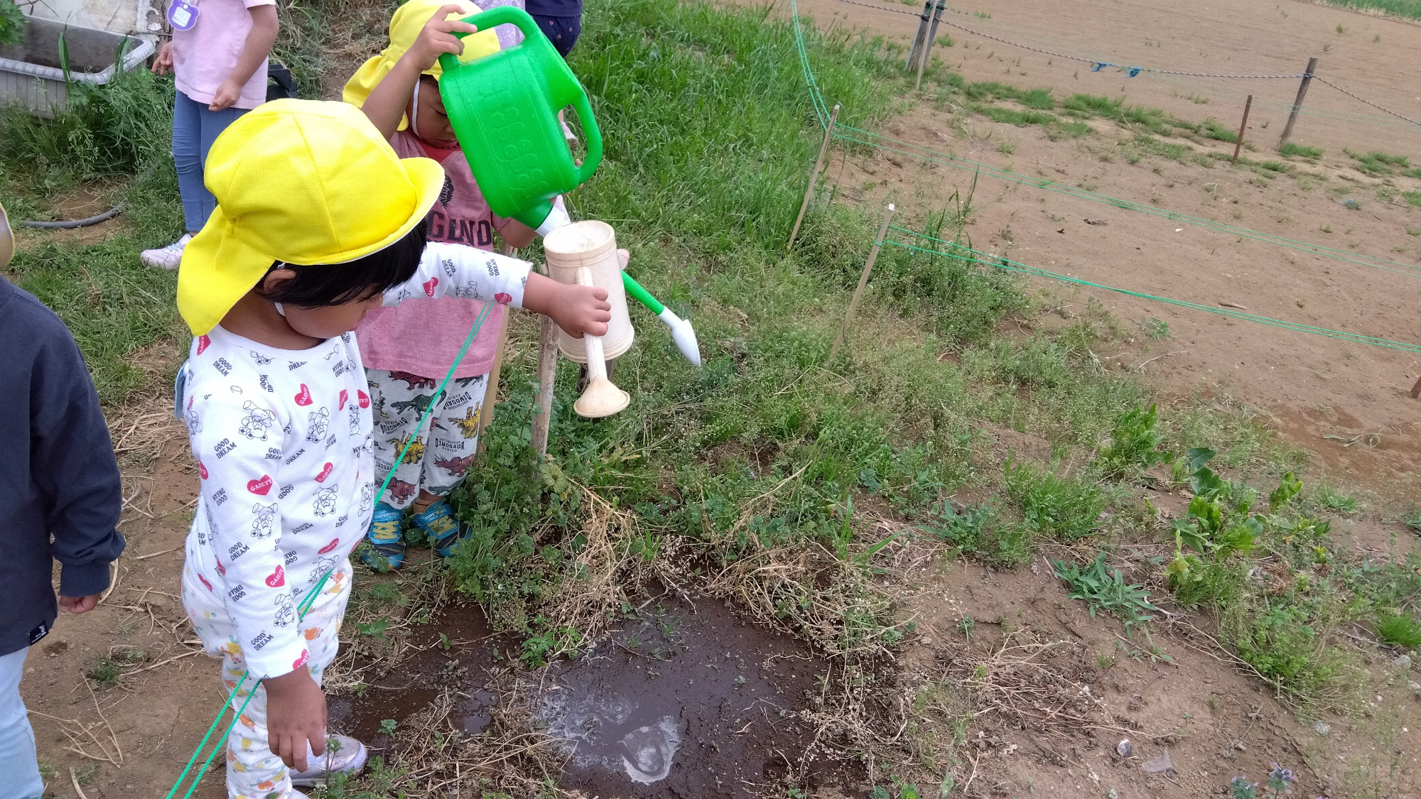 前年度の子どもの様子は畑に行くと近くの鶏小屋を見る、広い敷地を走るなどの姿が多く見受けられましたが今年度は友達やスタッフが作業している様子を見て、成長と共に「自分もやりたい」と思いが芽生え、じょうろを持ってきてくれました。これもひとつの小さな「やってみたい」ですね。こうした、「やってみたい」という感覚を増やしていけるように様々な経験ができるような環境づくりを行い、子どもたちとのかかわりを大切にしていきたいです。