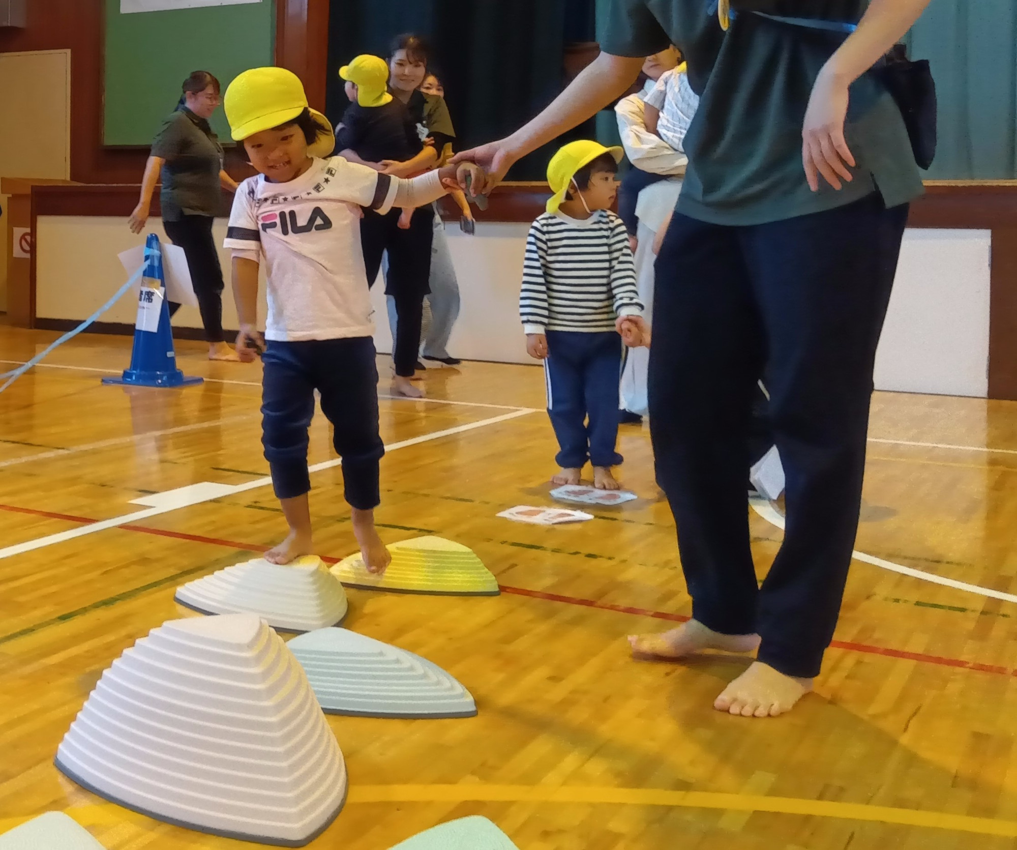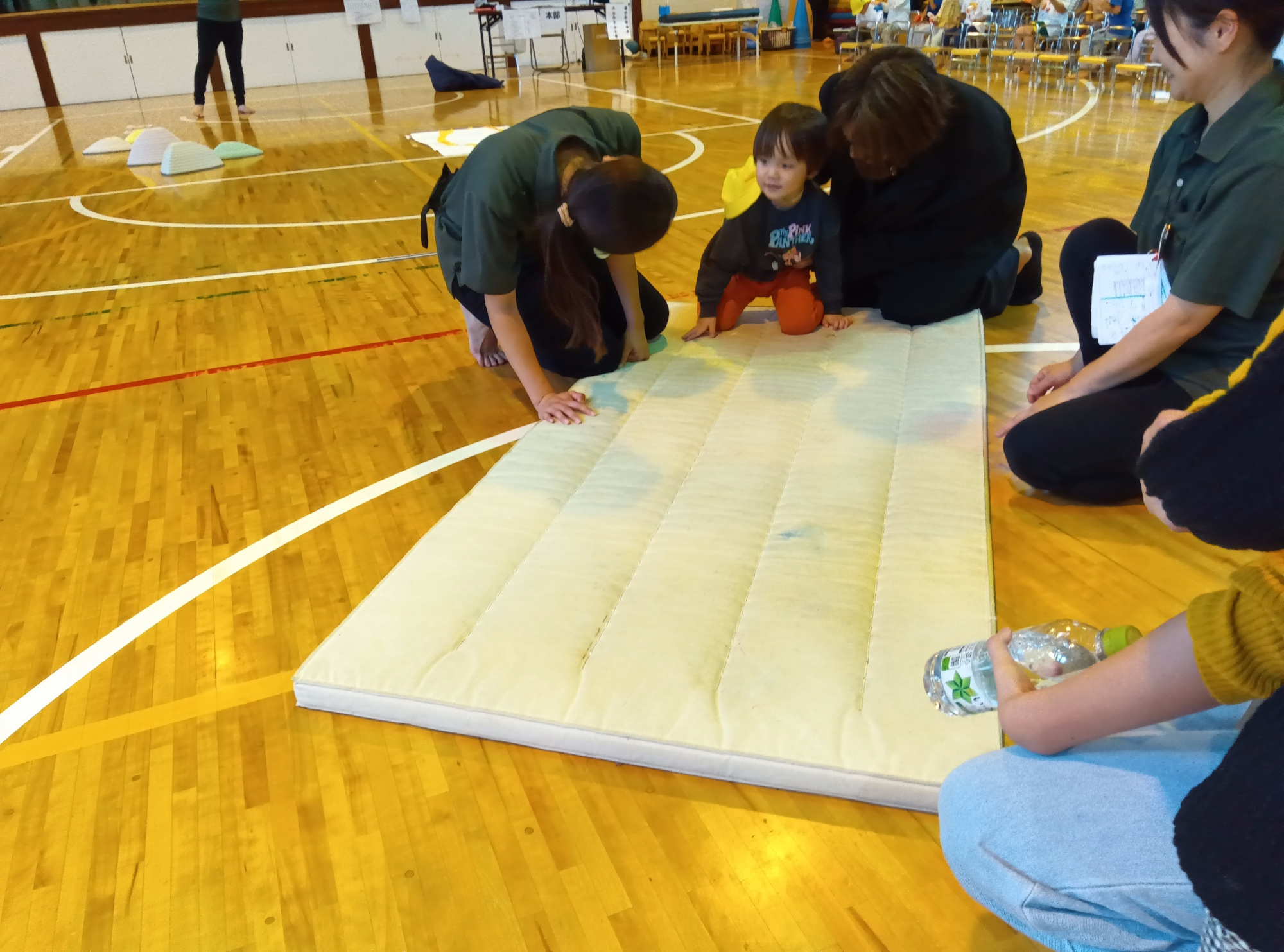 障害物競技では、日々の活動で取り組んでいる運動遊びを取り入れることで、見慣れた器具を見つけて進んで競技に参加することができました。時には保護者の方の力もお借りしてマットで前転の披露もできました。