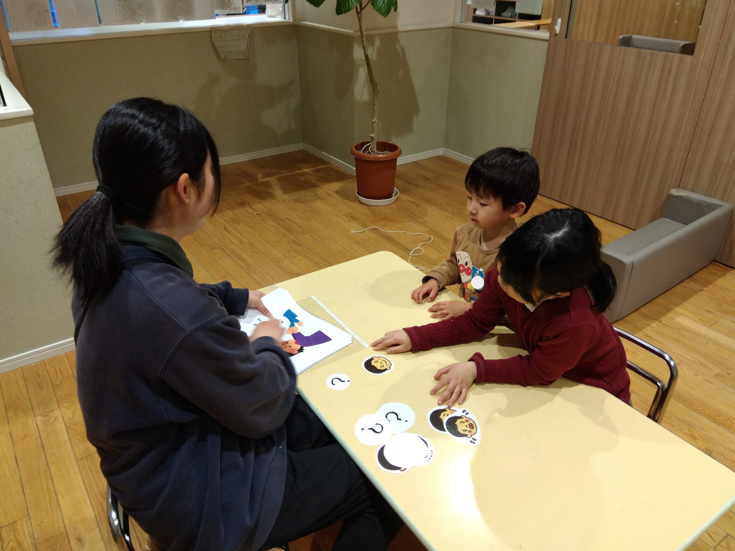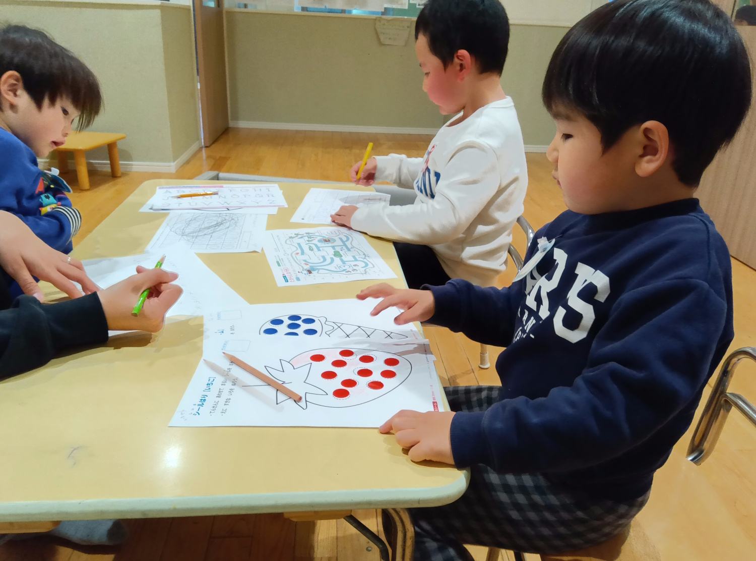 ようやく寒さも和らぎ、暖かい春の日差しを感じる日も増えてきました。毎日戸外活動を基本とした支援を行っていますが、平日午後と土曜日のビジター支援を中心に、椅子に座って机上で行う活動も取り入れています。