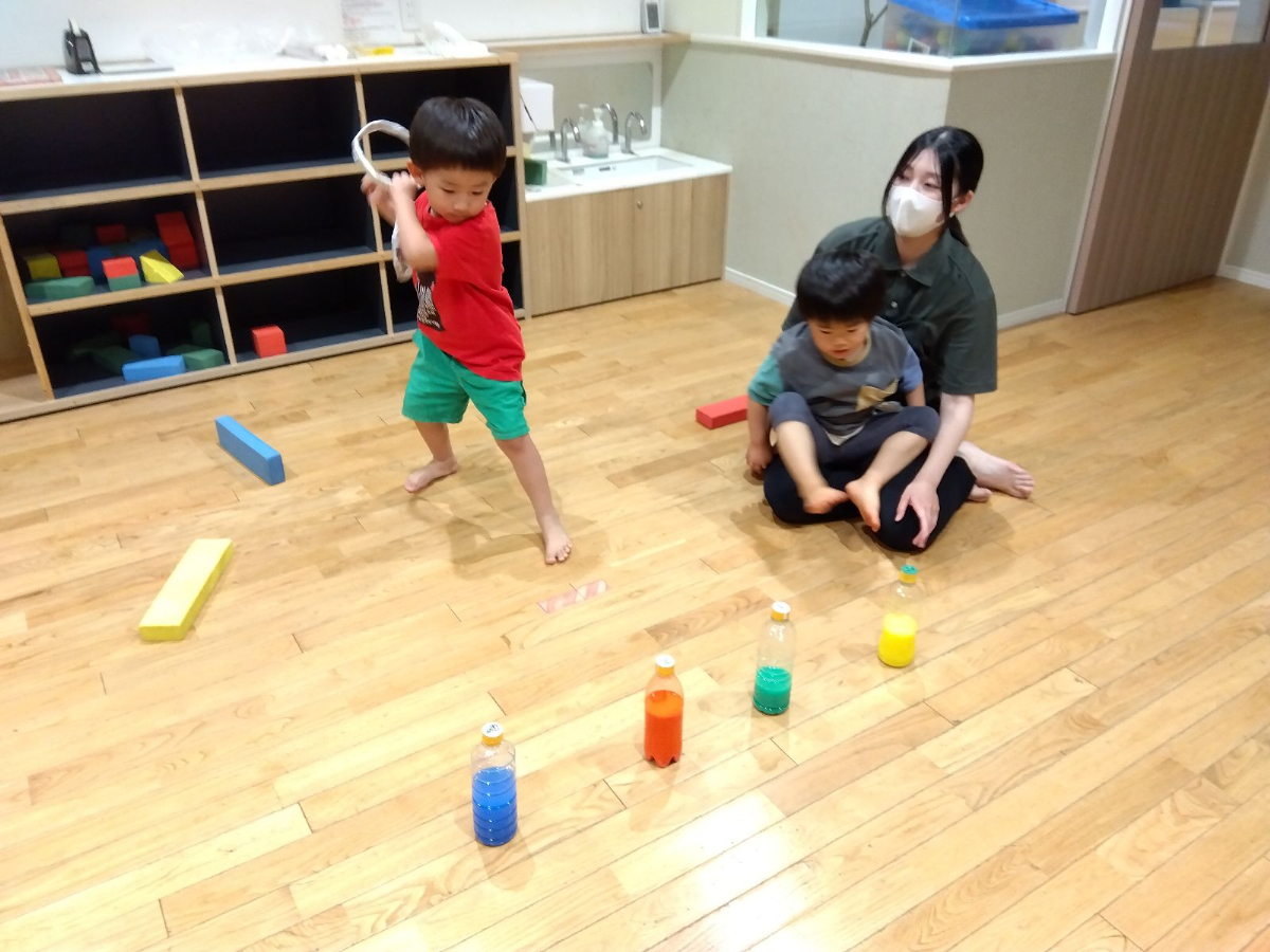 この遊びでは狙った物に輪を投げる目と手の協調性や、距離感を測りながら投げる力のコントロール力向上が期待されます。