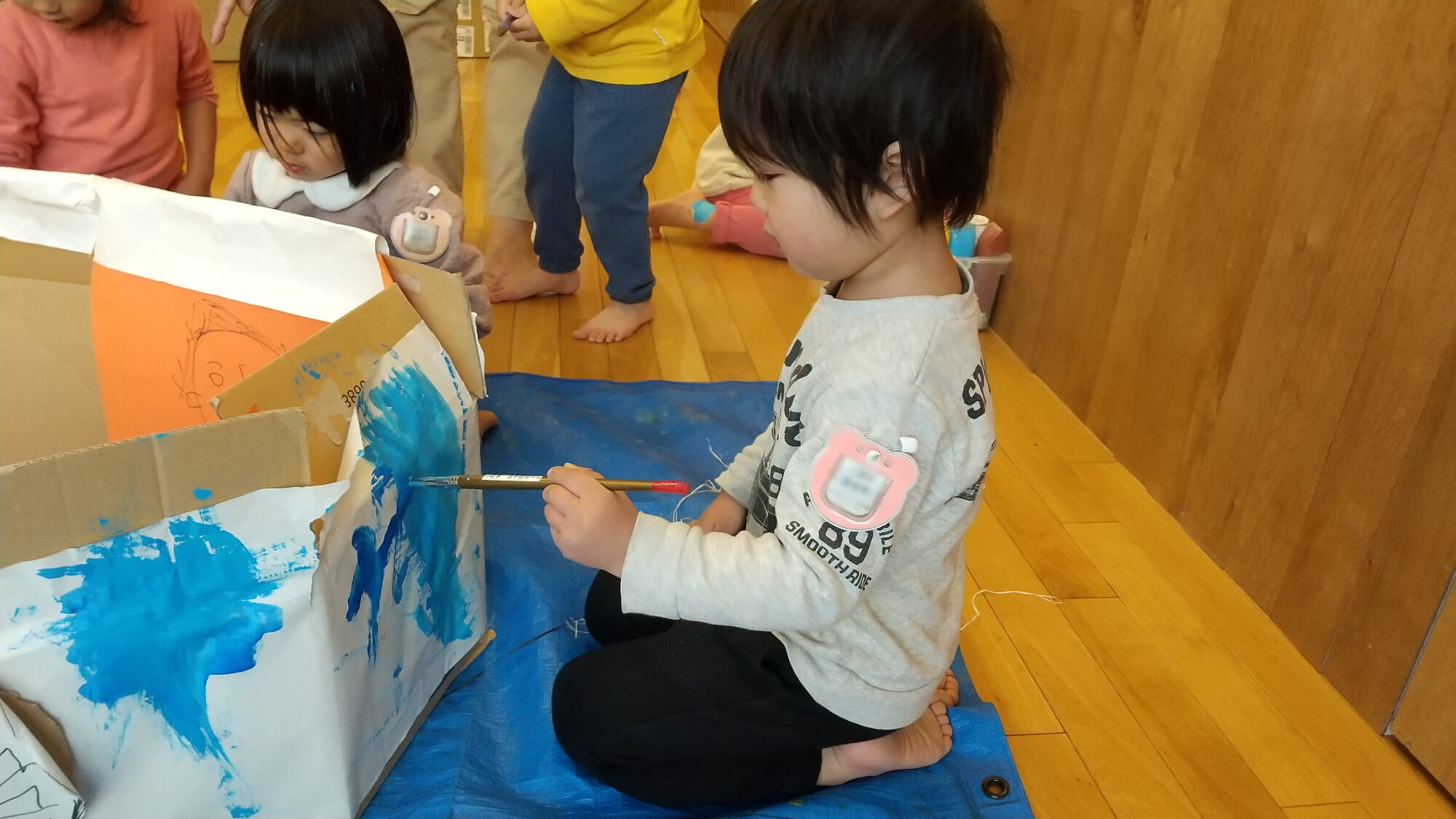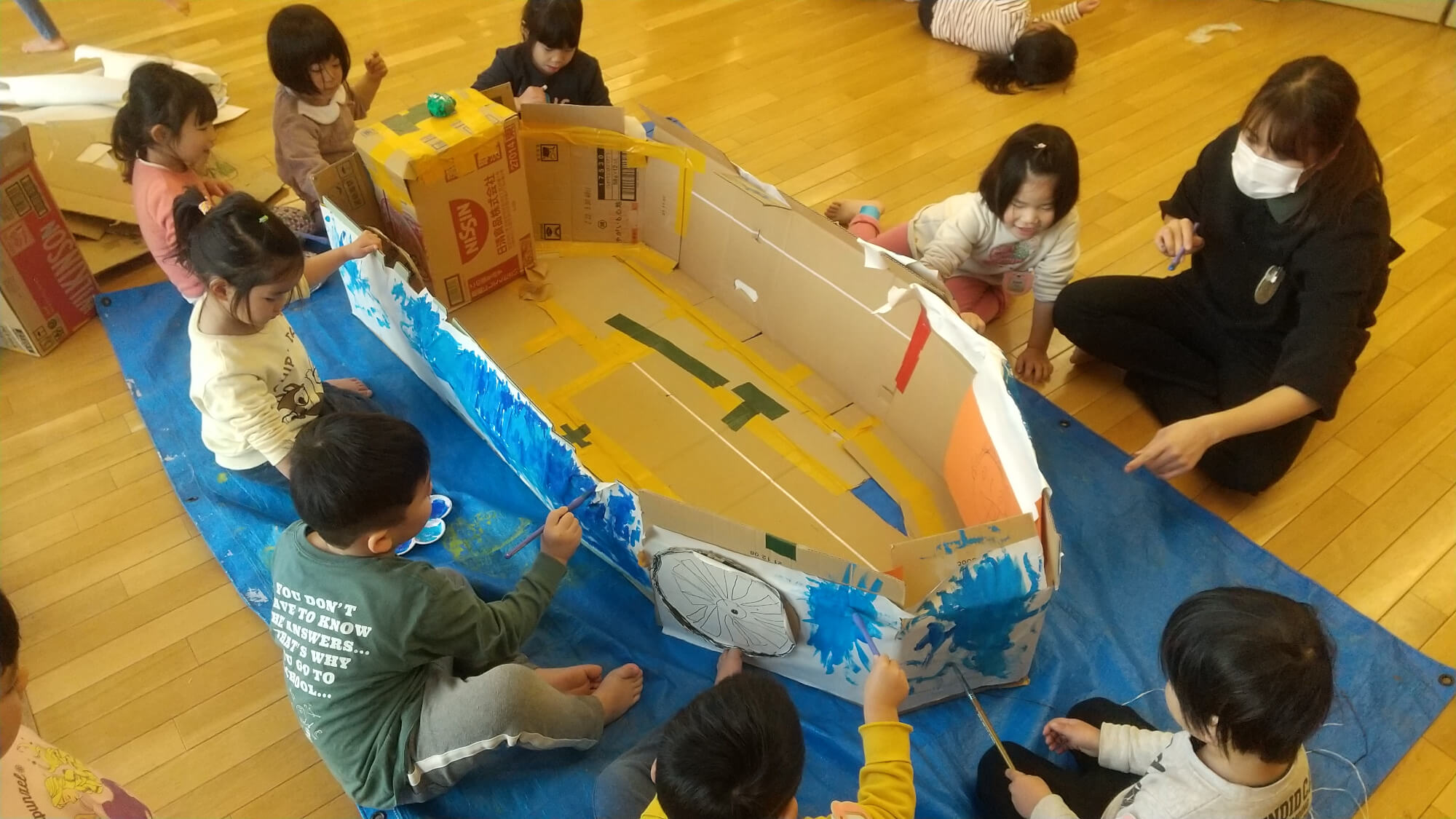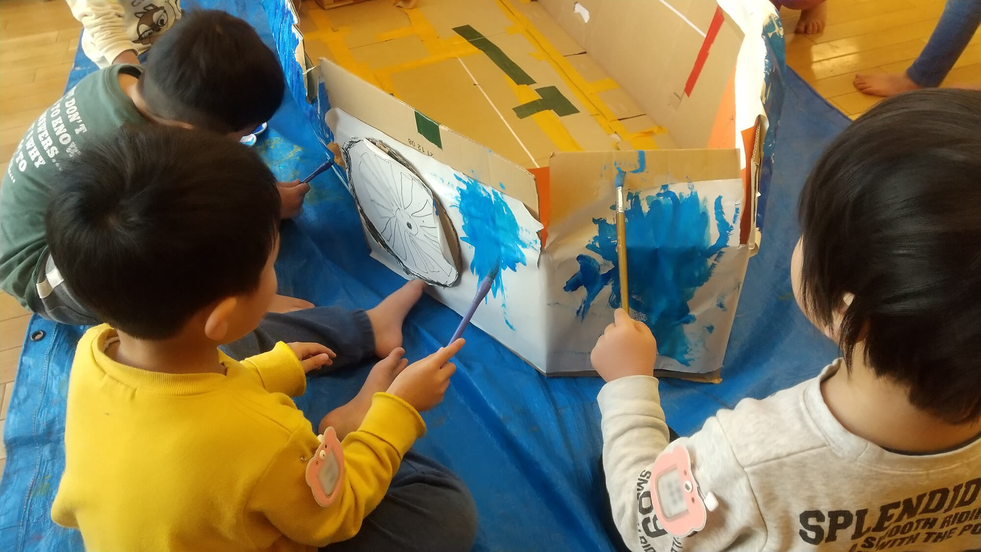 この日は劇で使う「車」の色塗りをすることになりました。ブルーシートを広げ、絵の具を用意するとそれぞれ思い思いに色を塗り始めました。