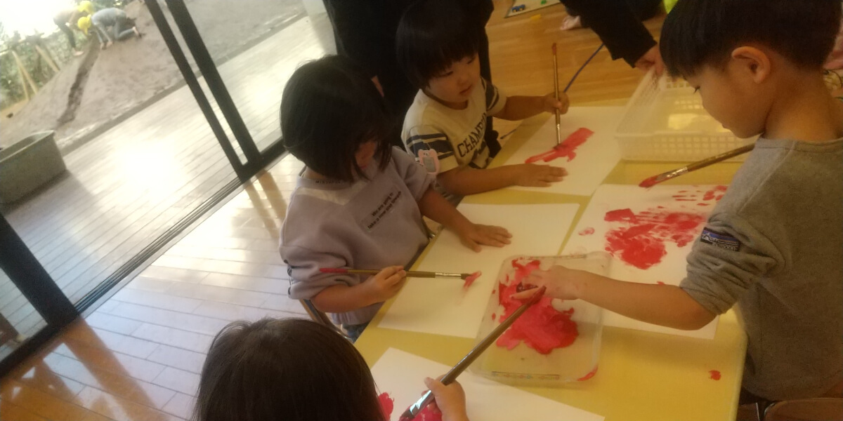 まずは絵具を使い、土台を覆う台紙を作りました。筆で塗り広げたり、手形をたくさんつけたり、思い思いに塗り広げました。5歳児の取り組みを見て、近くにいた3・4歳児も参加し、5歳児の作品を手本にしている姿も見られました。