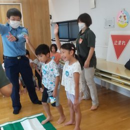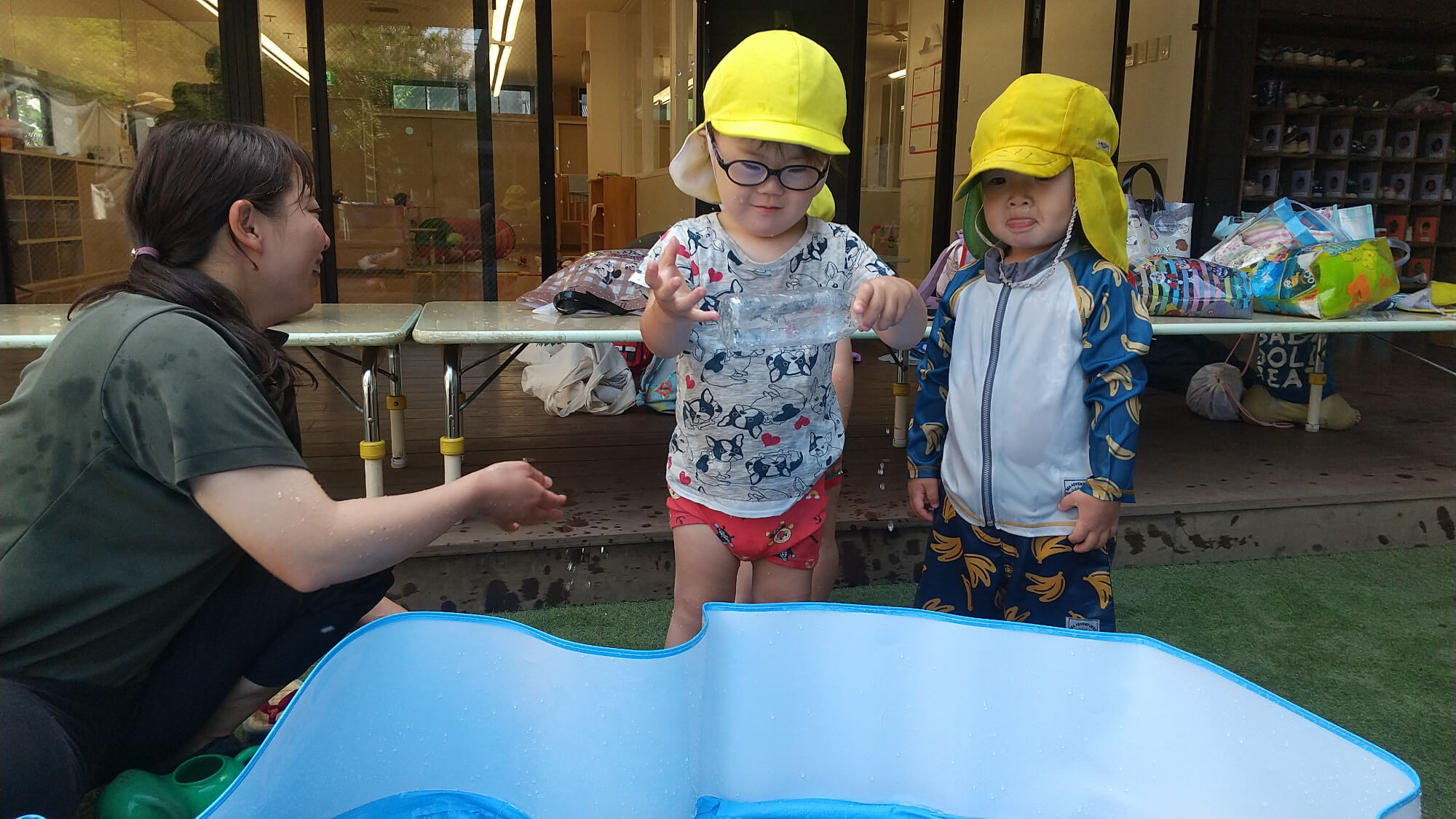 7月・8月は暑い日が続くため、戸外活動の代わりに、プール遊びをして過ごしました。自分で水着に着替え、プールに入るための準備運動に取り組み、始まったばかりのプールに子どもたちはみんなドキドキ。水に触れてみたり、様子を見てみたりと、色んな子どもたちの表情が見られました。こうして、子どもたちはたくさん体を動かして午前中を過ごしています。