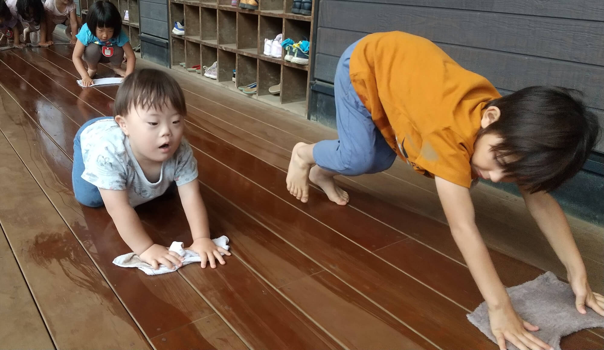 リズム体操と座禅の時間が終わり、縁側の雑巾がけをしている場面です。子どもも大人も、乳児も幼児も関係なく、みんなで取り組みます。縁側はみんなで使う場所なので、自分たちで綺麗にする意識を高めていきます。雑巾がけの体勢は、手で体を支えるため、筋力強化にもなります。一日の始まりに掃除をし、綺麗になった縁側を使って一日を過ごします。