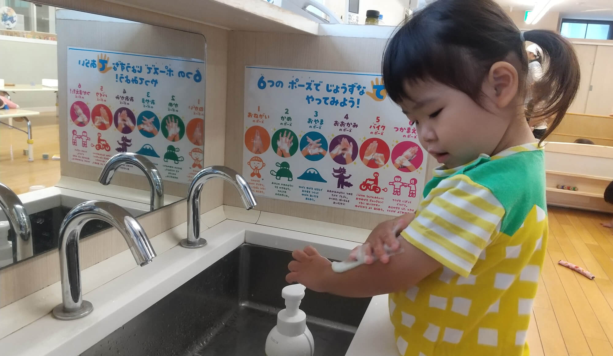 いよいよ待ちに待った給食の時間です。手を洗って給食の準備をしていきます。手を洗っているかと思いきや、泡を腕に塗って遊んでいる様子がありました。とっても真剣な表情で取り組んでいます。冷たい温度、ぬるぬるした感触、もこもこした泡の触り心地など、日常の何気ない動作にも色々な発見があります。遊びながら手を洗い、子どもたちは生活動作を学んでいきます。
