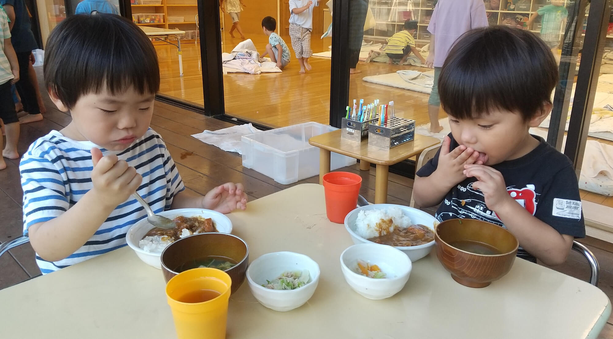 配膳もおわり、給食の時間が始まりました。毎日調理スタッフが美味しい給食を園内で作ってくれています。午前中、たくさん体を動かしたので、子どもたちはみんなお腹ペコペコです。しっかり食べて、丈夫なからだを作ります。大人と友達と一緒に「おいしいね」「もっと食べたいな」「お皿ピカピカだね」と話しながら食べる給食は絶品です。また、食べ終わった食器は自分で下膳します。自分のことは自分で行いながら、生活する力を育んでいきます。