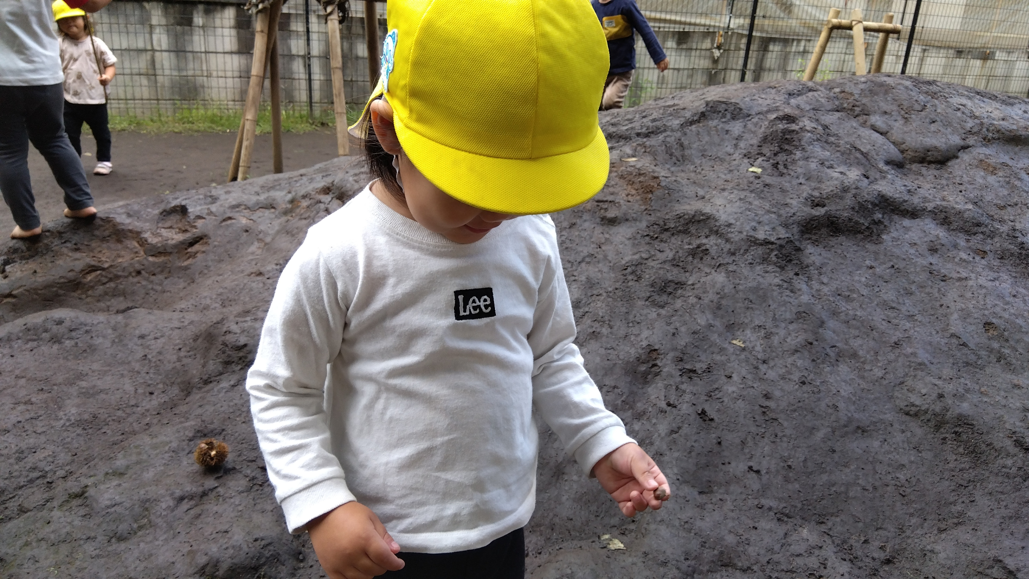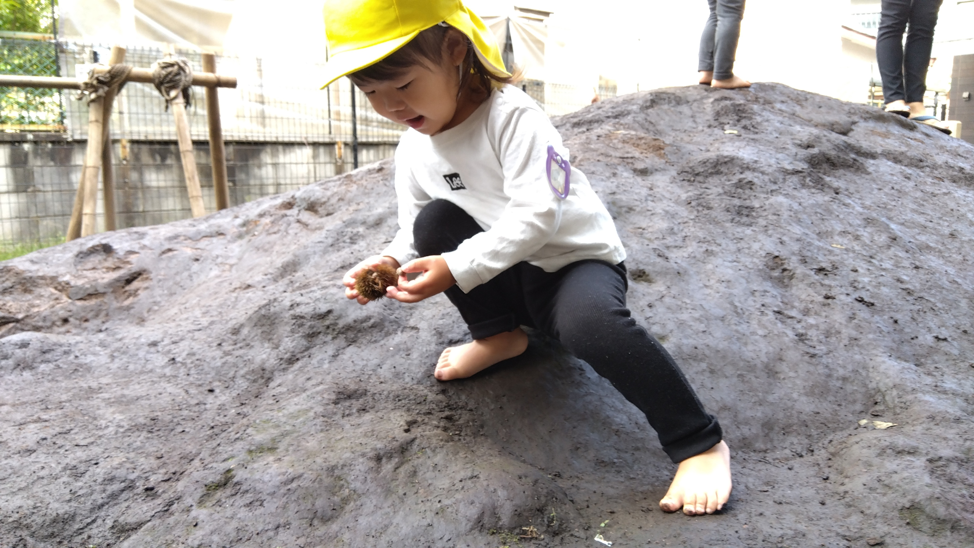 酷暑を乗り切り、気温が落ち着いてきた10月。この時期は落ち葉やすすき、ドングリなど自然物からいろいろな秋を感じることができます。どろんこ保育園の園庭には栗の木があります。今年は例年に比べ、たくさんの毬栗が落ちてきました。そんな秋の贈り物を見つけた子どもたちの一コマです。