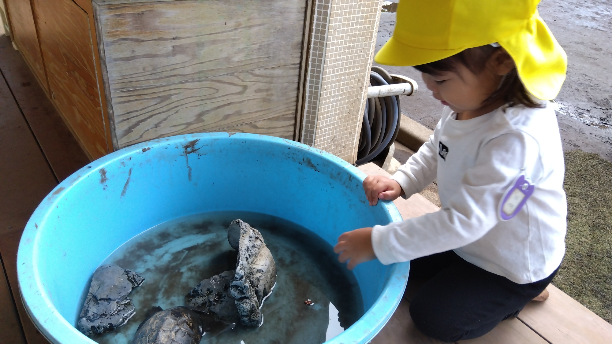 なんと園庭に置いてある亀の水槽まで近づき、亀に食べさせようとしました。その後も、他の栗を見つけては亀の水槽に行き、餌をあげることを楽しんでいました。