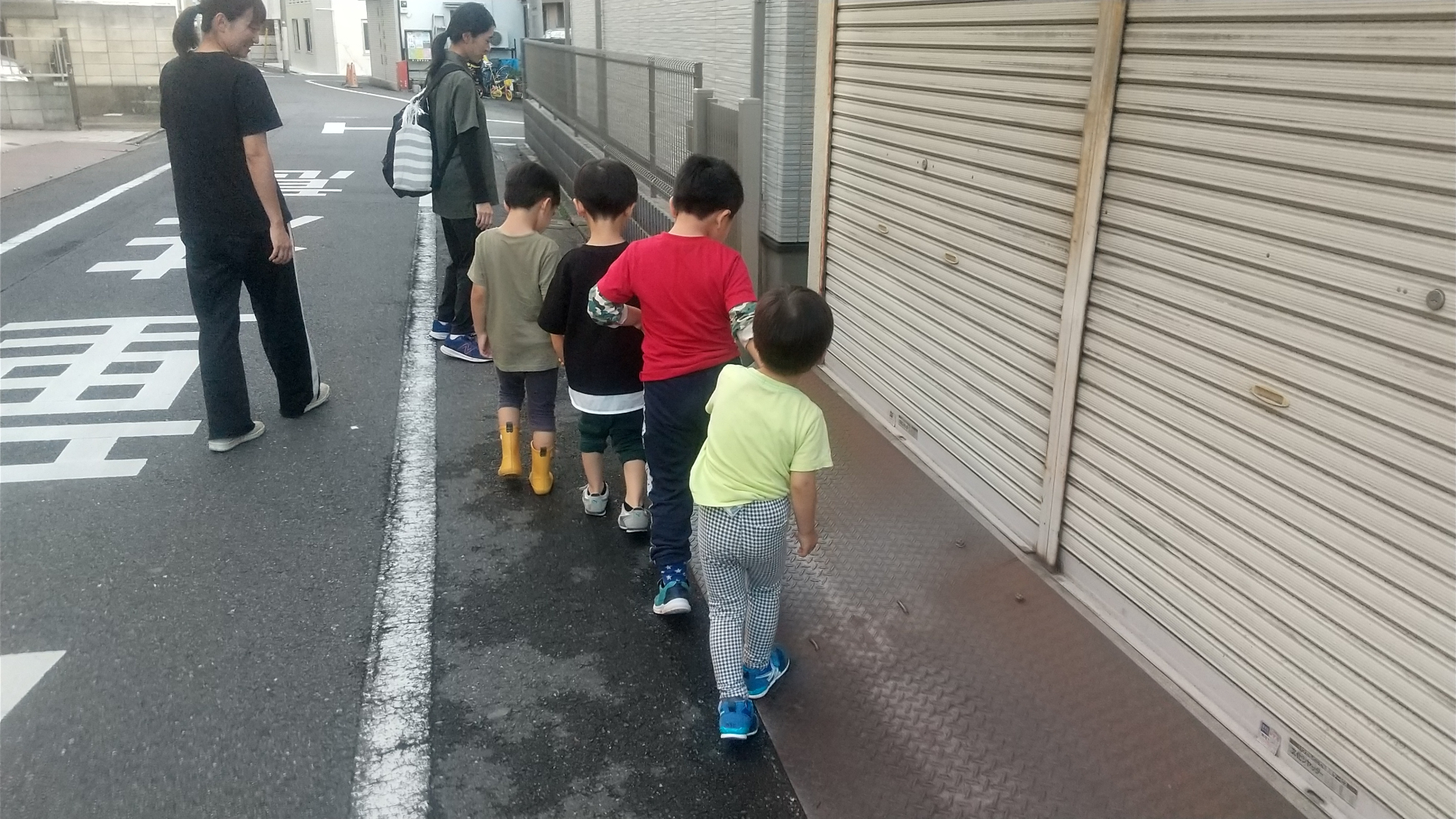 散歩では、子ども同士で手をつないで歩き、歩きながら見つけた物を伝え合っています。また、交差点では車が来ていないかの確認や、白線の内側を意識して歩くなど、子ども自身が交通ルールに気づき守れるように、スタッフは「交差点では何を見るの?」、「格好良い歩き方ができているかな?」などの言葉かけをします。