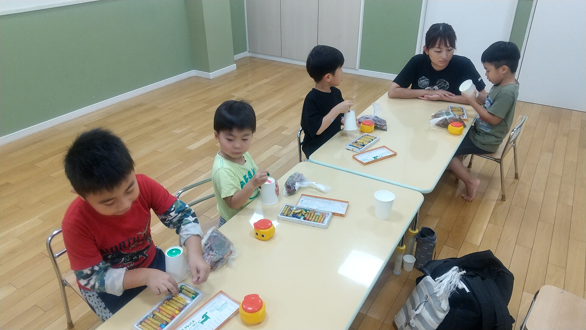紙コップにクレヨンで絵を描き、顔を作ったり、周りをいろいろな色で塗ったりと思い思いに仕上げていきます。隣にいる友達の作品を見て同じようにする子もいました。自己表現をすることや、さまざまな道具を使うことで指先の操作や、素材の感触を体感する時間になりました。