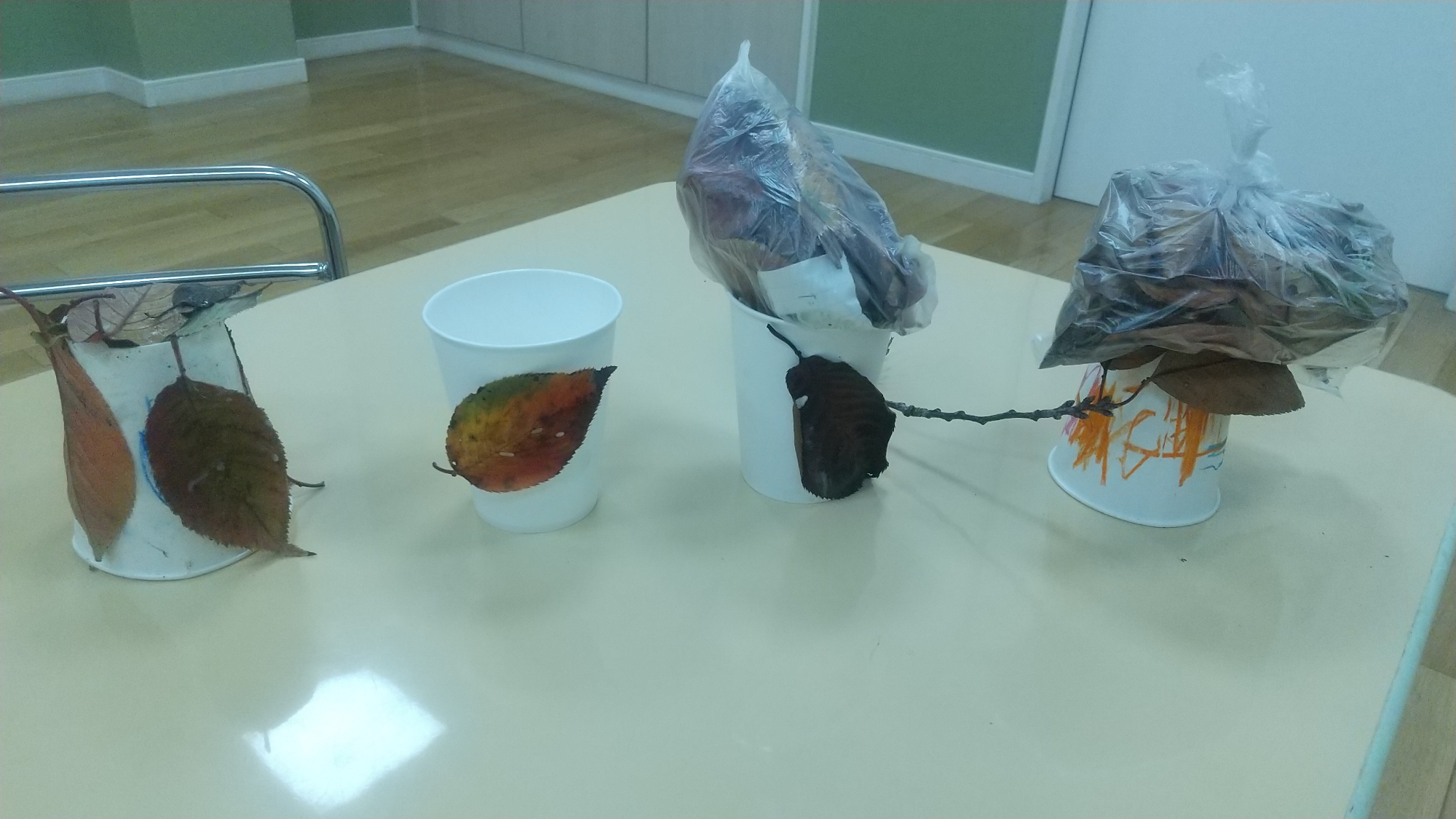 つむぎに帰ってからは、拾ってきた落ち葉で工作をしました。
