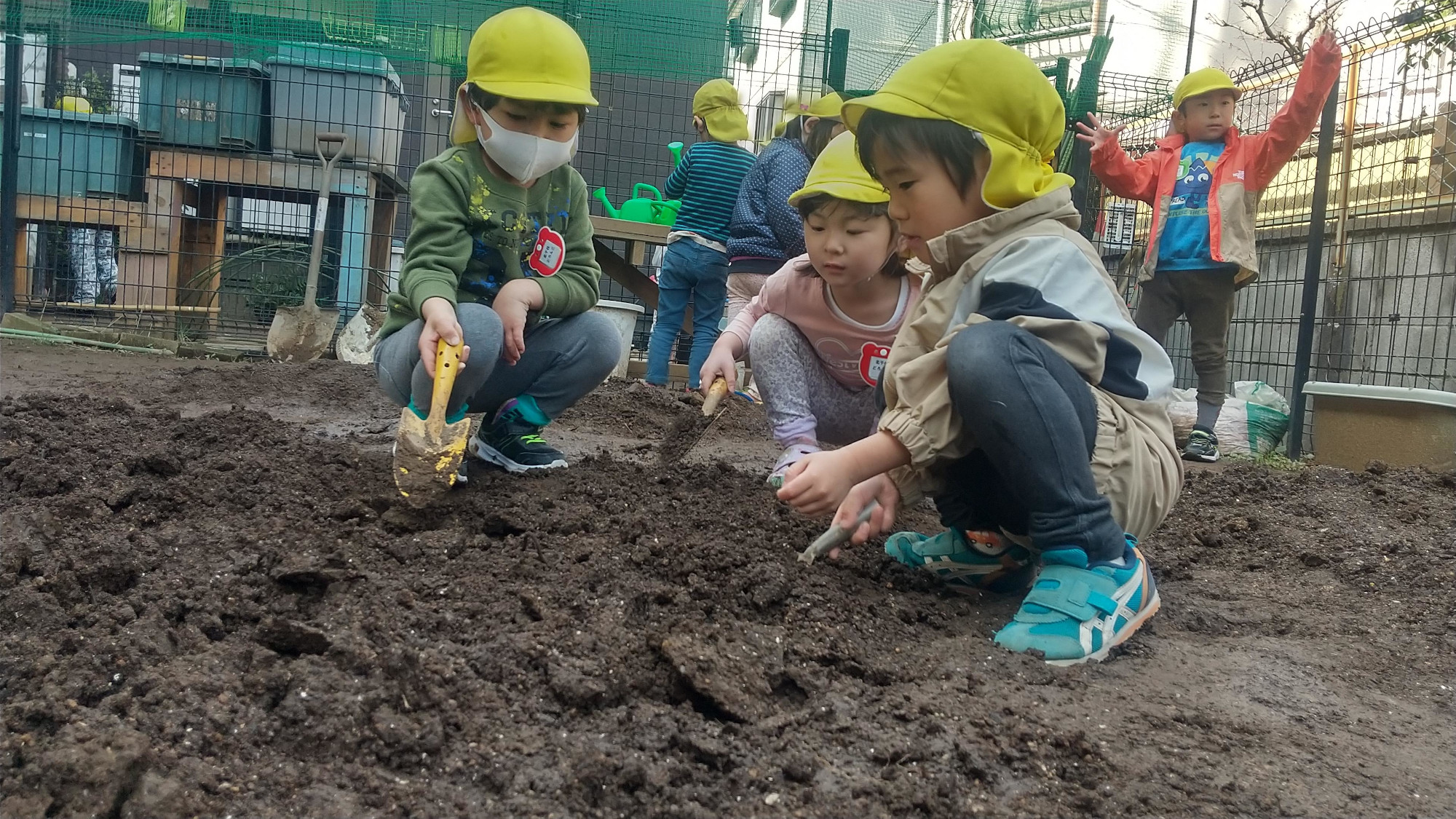 発達支援つむぎ 北千住ルームには、北千住どろんこ保育園が併設されており、保育園児もつむぎ利用児も、一緒に畑仕事に取り組みます。