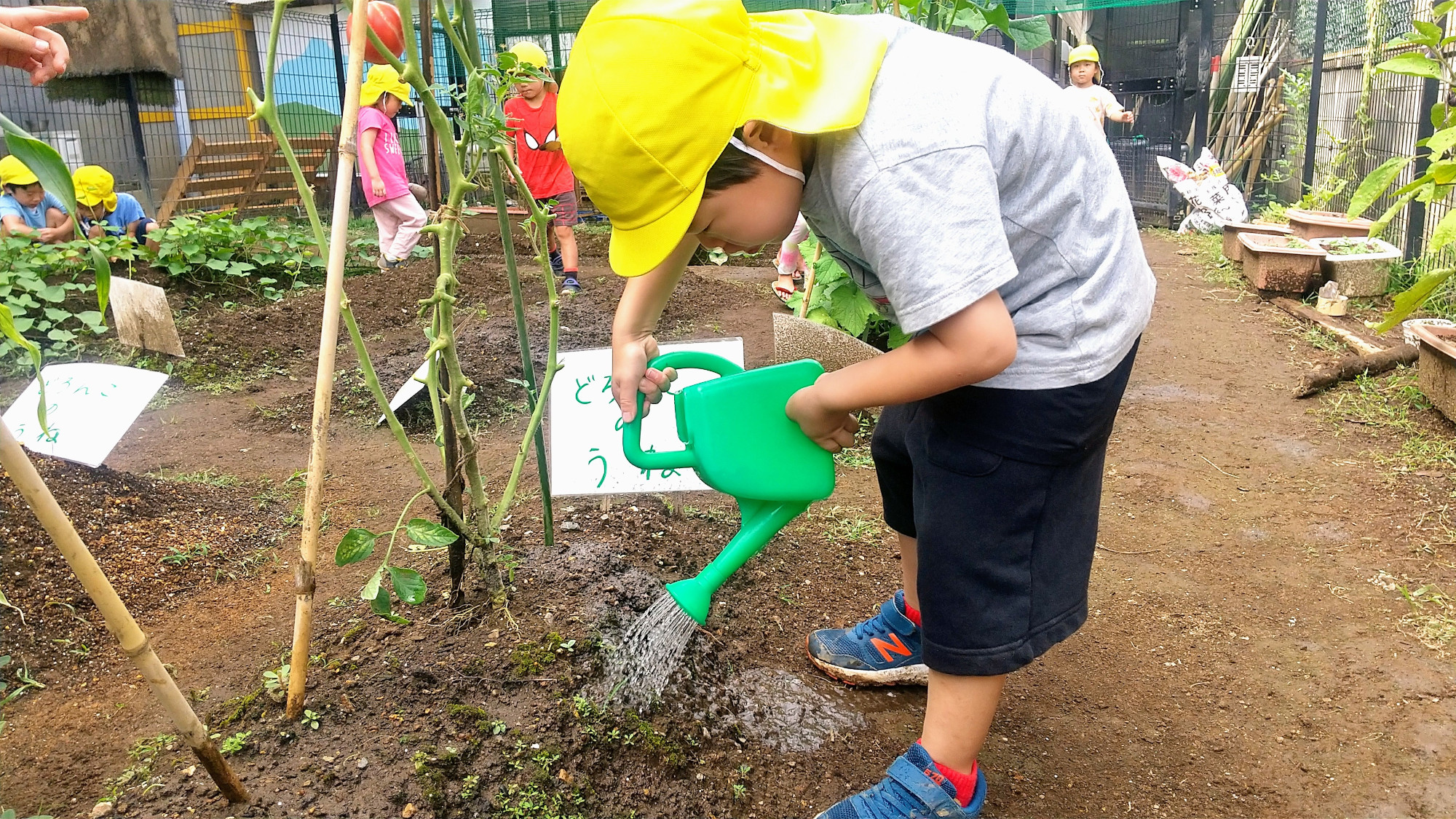 ある日のこと、子どもたちはトマトが実っていることに気が付きます。しかしそのトマトはまだ小さく緑色。「大きく赤くなったら、収穫して食べようね。トマトが育つには水をあげないとね」と伝えると、その日から積極的に水やりに取り組むようになりました。
