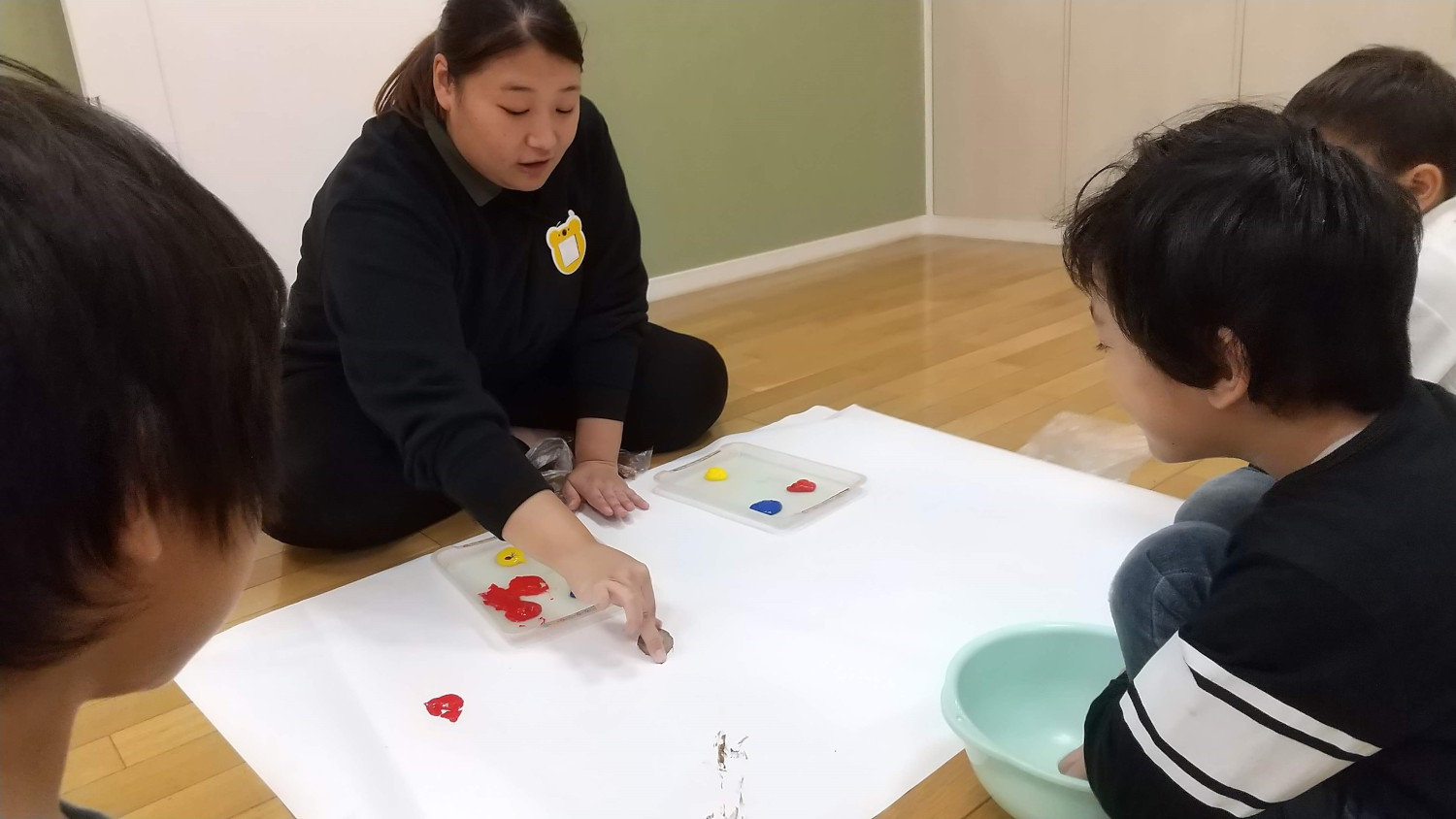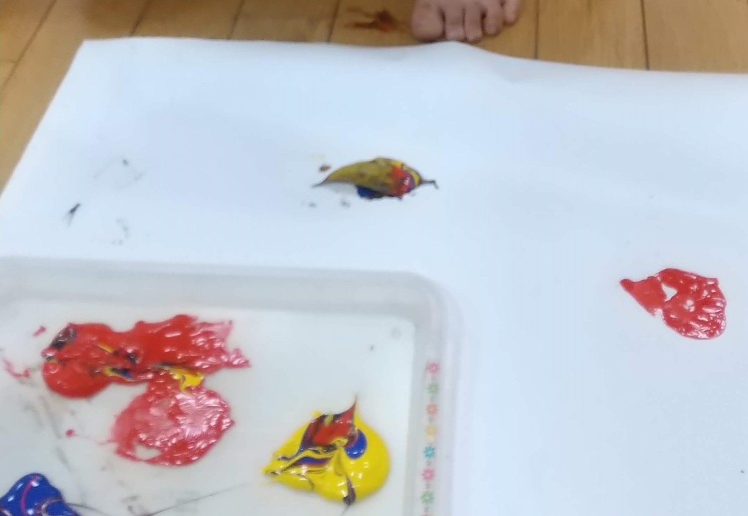 スタッフが絵の具を出して、拾ってきた葉っぱに絵の具をつけ、紙に押し付けます。