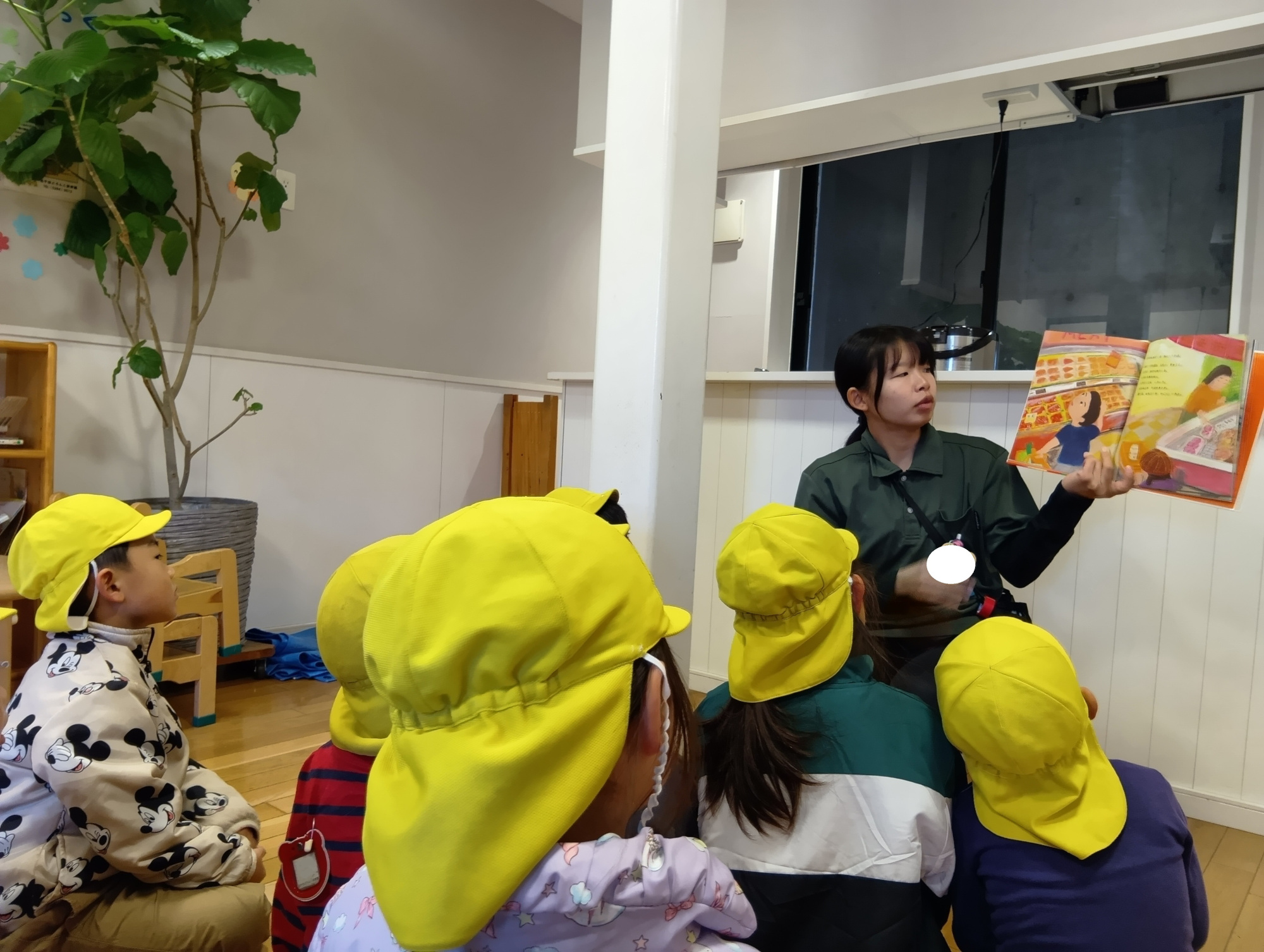 食材の成り立ちについて、子どもたちに絵本で説明する様子