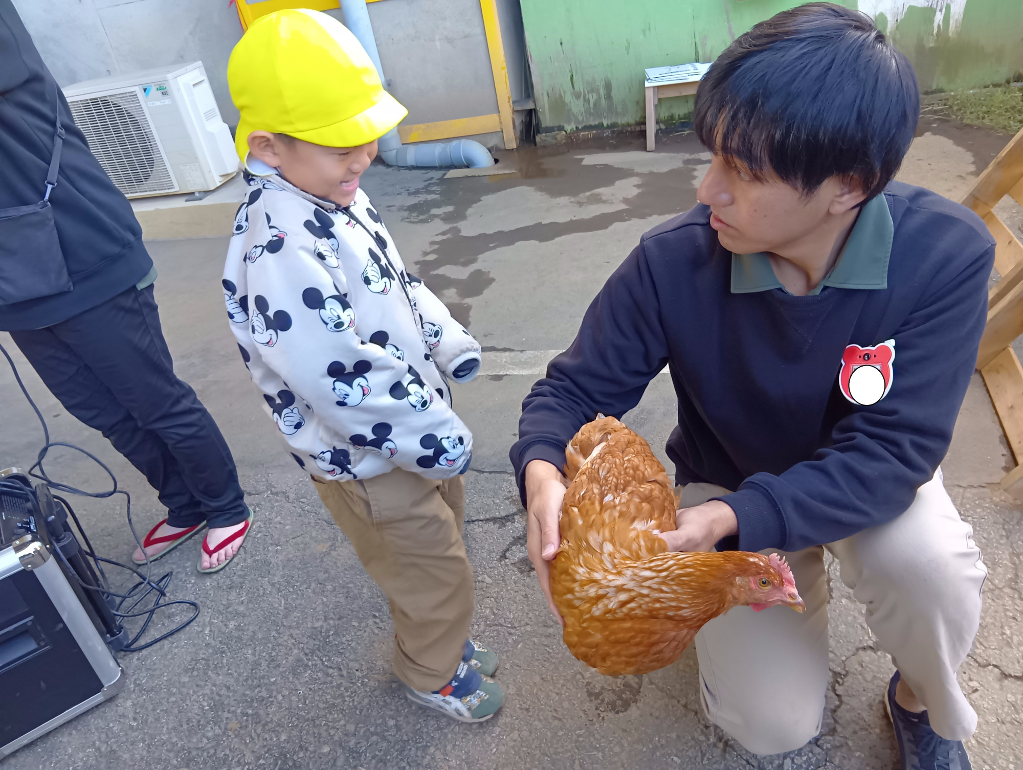 捌く鶏(園庭で飼育している鶏)を見せる様子