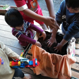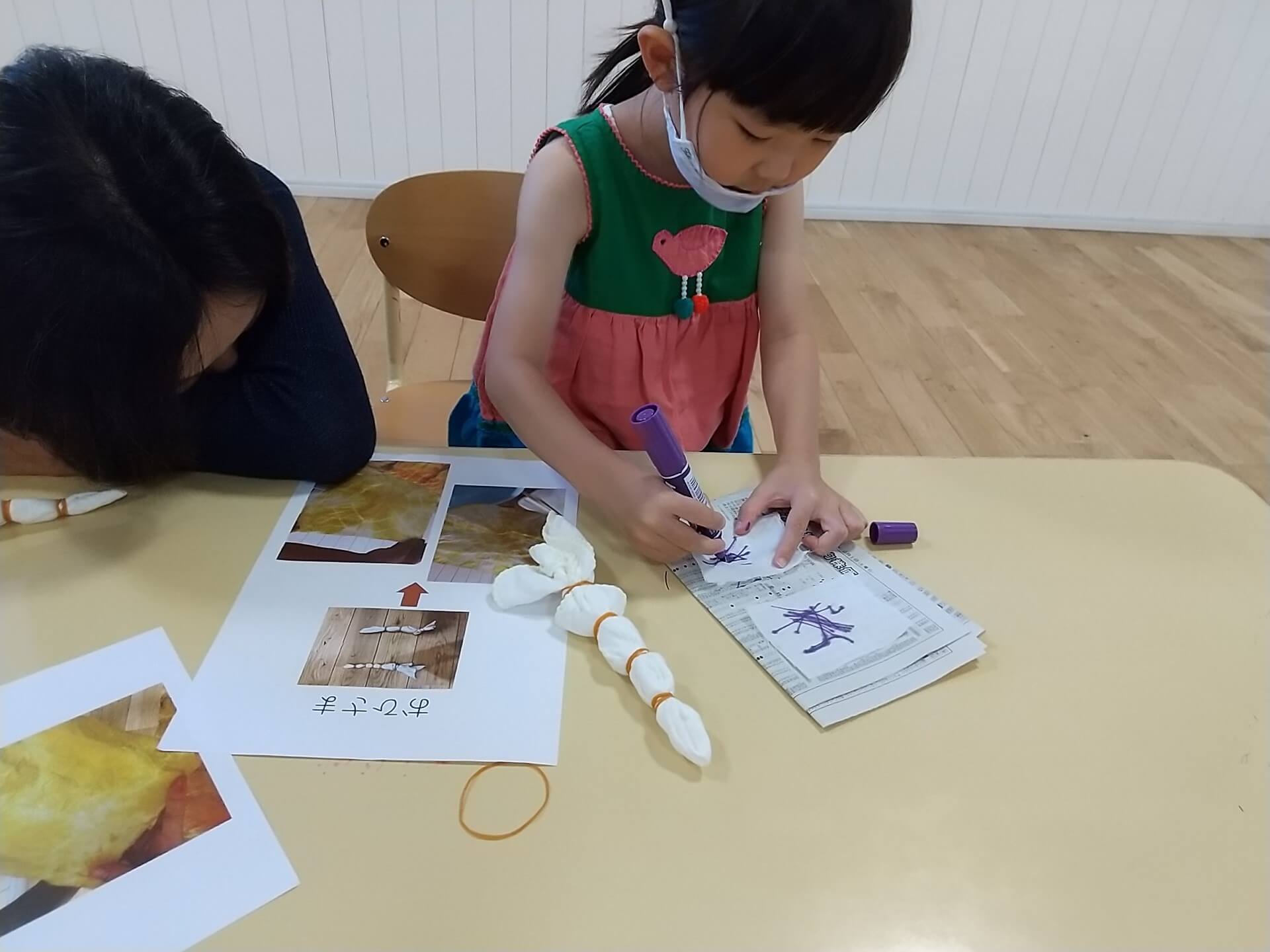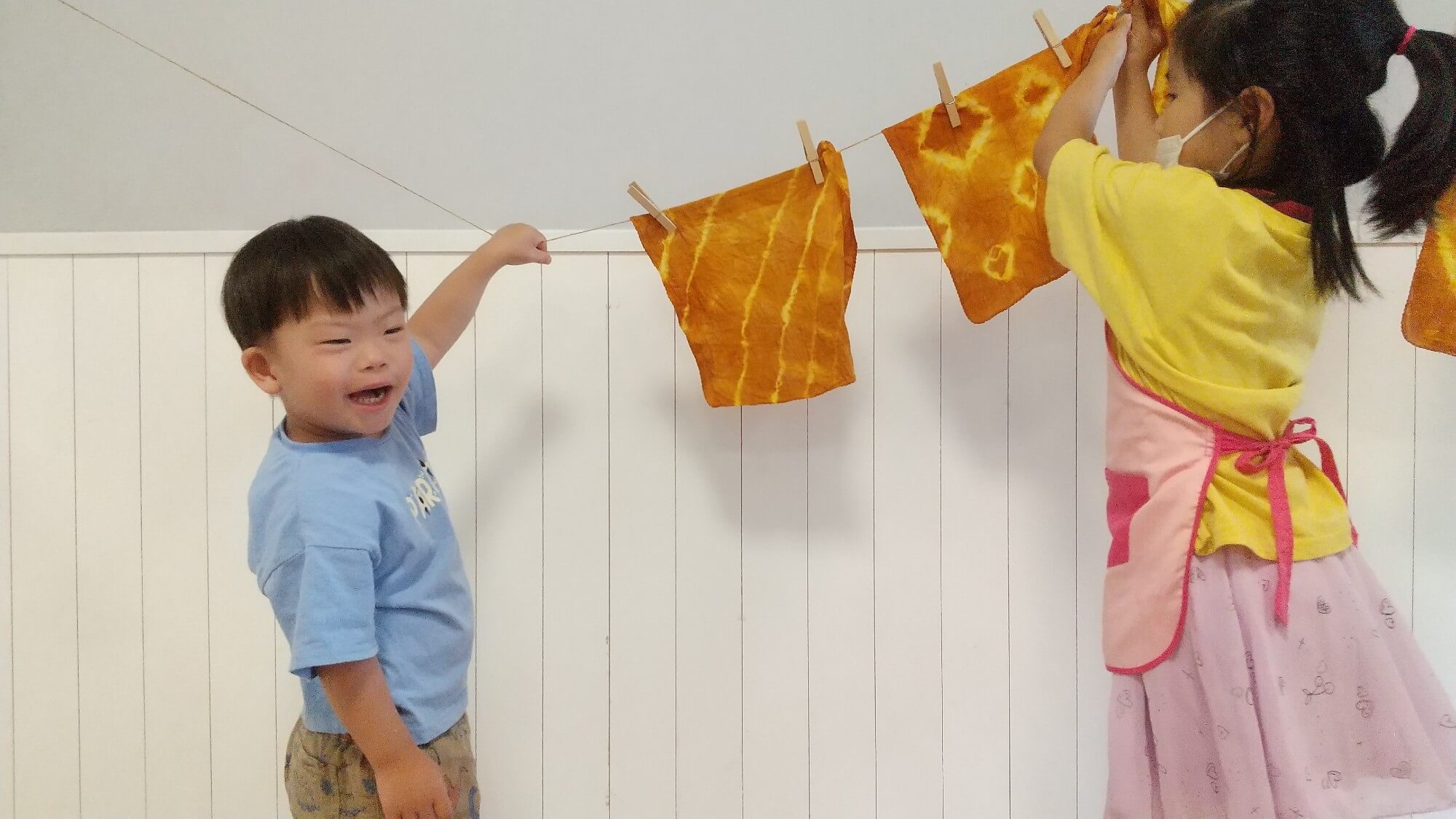 「わあ!」「これ僕が作ったんだよ」「見てみて」とみんなとても良い表情でハンカチを眺めたり、おうちの人に見せたりしていました。お洗濯気分でハンカチを絞って、干しました。全部違った模様で、全部ステキだね。