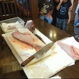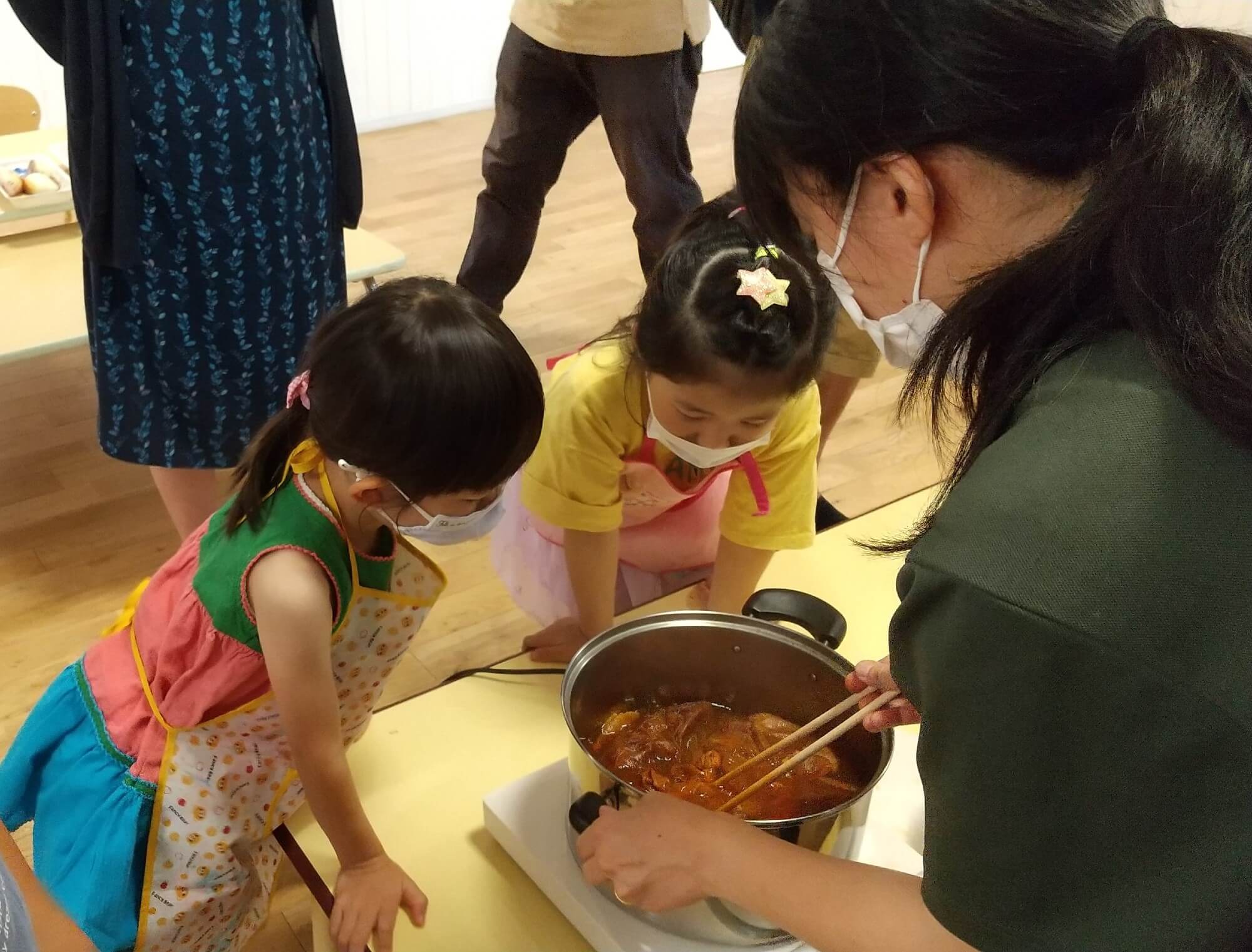ハンカチをお鍋に入れて色が染みこむのを待つ間は、玉ねぎスタンプで遊びました。縦に切った玉ねぎ、横に切った玉ねぎ、半円の玉ねぎ、いろんな模様になりました。