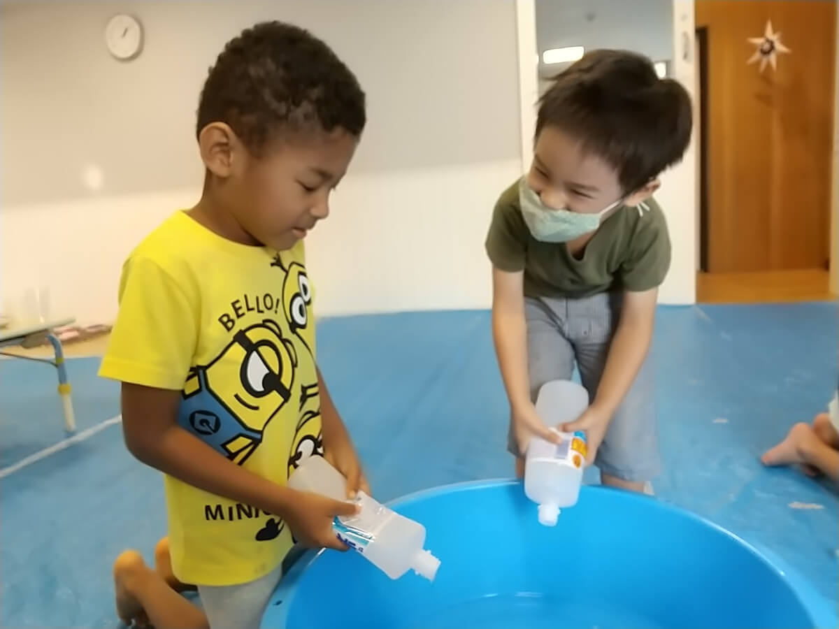 まずはみんなでスライム作りに挑戦します。普段は、コップ一杯くらいの量で作るスライムを、今回は大きなタライを使って、10倍以上の量で作りました。