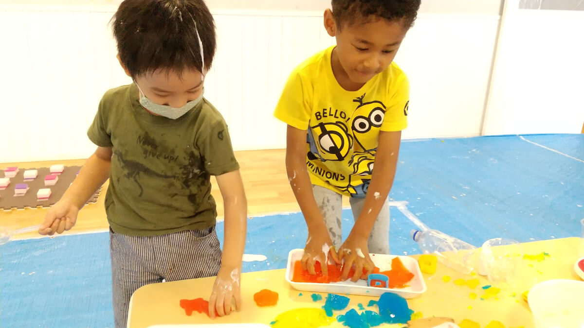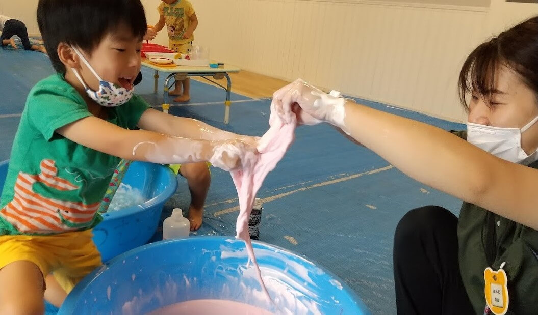 大量のスライムに、子どもたちは大興奮です。いつもはドロドロした感触や服が汚れることが苦手な子も、夢中で楽しむ姿が見られました。