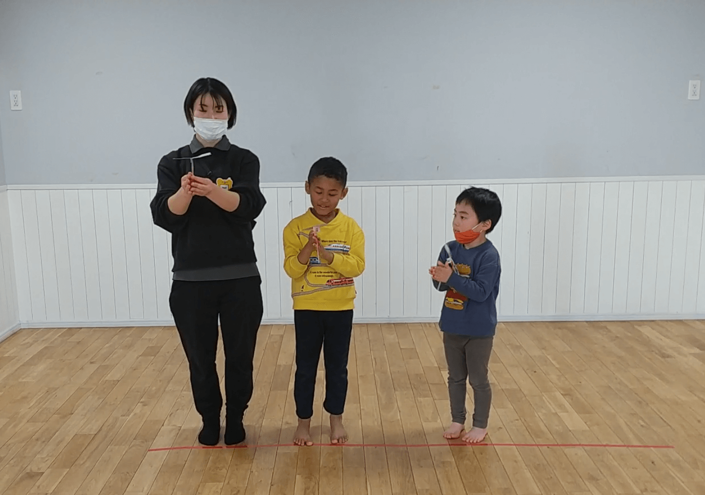 みんなで「歩いて竹とんぼを取りに行こう」「線は越えないようにしよう」と体を使いながら説明し、ゆっくりひとつひとつのルールを確認することで、ルールを意識して遊ぶことができました。