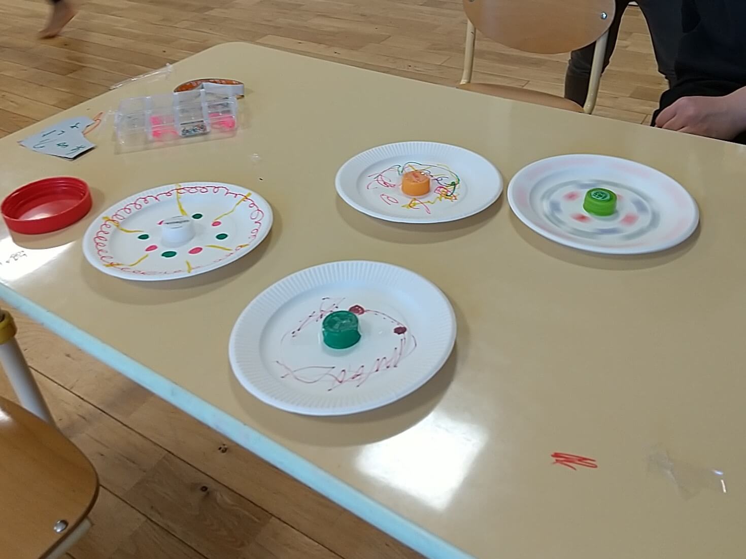 両手を使って回す竹とんぼと片手で回すコマ。床では似たような回り方をしていましたが、材料や作る工程、遊び方に違いがあることを作って、遊んで体験することができました。