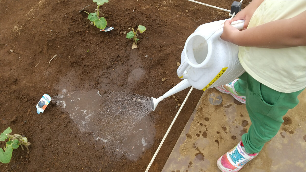 また今年度は、畑に野菜を植えるだけでなく、プランターでも野菜を育てています。畑と同じ種類を植えてどちらが大きくなるか、比較して楽しんでいます。保護者の方からも、「きゅうり、大きくなりましたね」と声をかけていただき、ルーム全体で野菜の成長を見守っています。