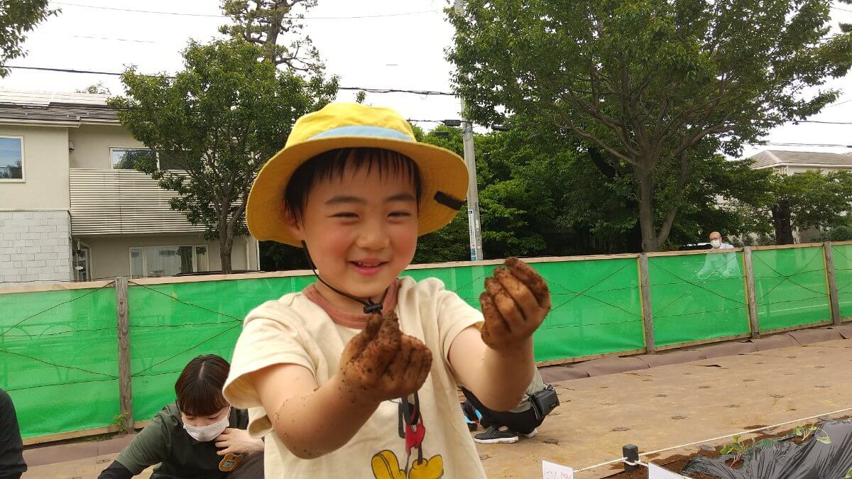 去年から畑仕事に参加している子どもたちも、新たな場所で畑仕事のスタートです。普段さわっている土との感触の違いに、スコップですくってみたり、手でつぶしてみたりと、みんな興味津々の様子。畝づくりでは、大人が使うような大きいスコップを使うことにも挑戦し、「よいしょ、よいしょ」と大きな声を出しながら頑張って畝を作っていました。
