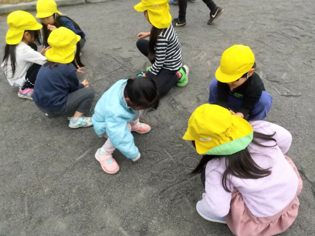 戸外の遊びで子どもたちに大人気の鬼ごっこ。この日は、様々な「かたち」への関心が向けばと考えたスタッフが「かたちおに」を提案しました。地面に様々な「かたち」を描き、鬼が言った「かたち」に逃げなければつかまってしまいます。はじめは、◯△□のみでしたが、遊んでいるうちに子どもたちがハートを描いたり、小さな□、大きな△を描いたりと、逃げる「かたち」の場所が増えていき、盛り上がっていきました。