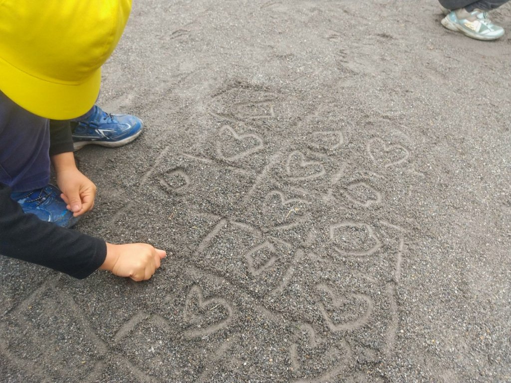 その横で砂遊びをしている子どもたちも、「かたちあそび」をしています。地面に線を引いて〇×ゲームが始まりました。同じかたちが3つ揃えば勝ちです。頭を使う勝負に白熱して、何組もの決戦が行われていました。ここでも、ハートやダイヤなど、自分たちの好きな「かたち」で勝負する子がいました。中には、線をどんどん広げていき、大きな枠の中に3つ揃えられるかな?とゲームを発展させるグループもありました。
