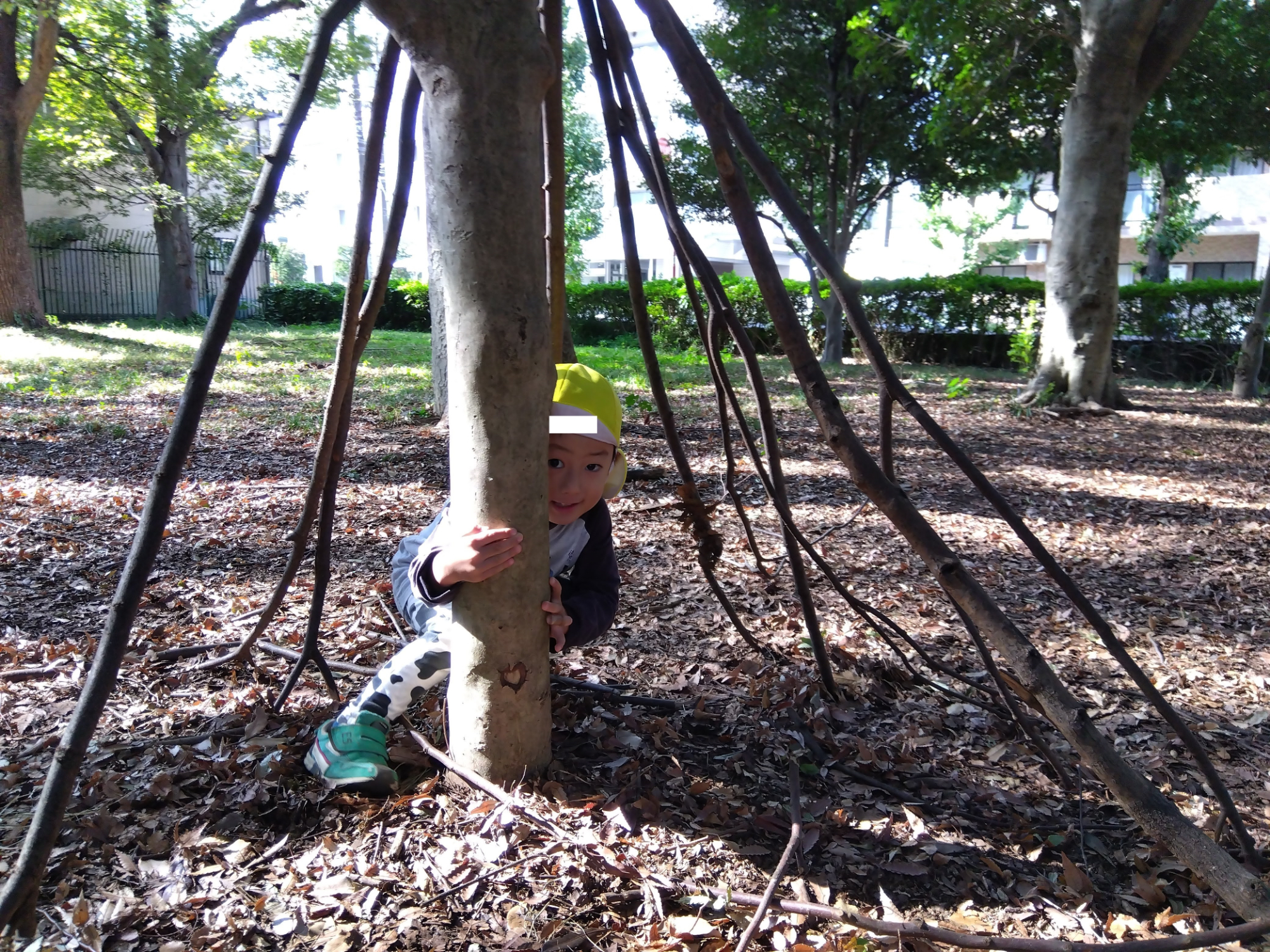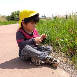 一つ目は、「ミスターパーク」です。今までより少し遠くまで足を延ばして見つけた遊び場です。道中に咲いている花を見つけ「あ、トマトみたい!!」「たんぽぽがあった!」など、新しい発見に心を躍らせながら向かいます。広場に到着すると、植木の中を「冒険しよう!」と、枝を杖のように使って探検しながら遊んでいます。自分の目で見て、手で触って一つ一つ確かめながら新しいものとの出会いを楽しむ子どもたちの姿に、自然に直に触れてホンモノを体験することの大切さを、大人も改めて感じさせられました。まだまだ新しい遊び方が増えていきそうな予感がしています。