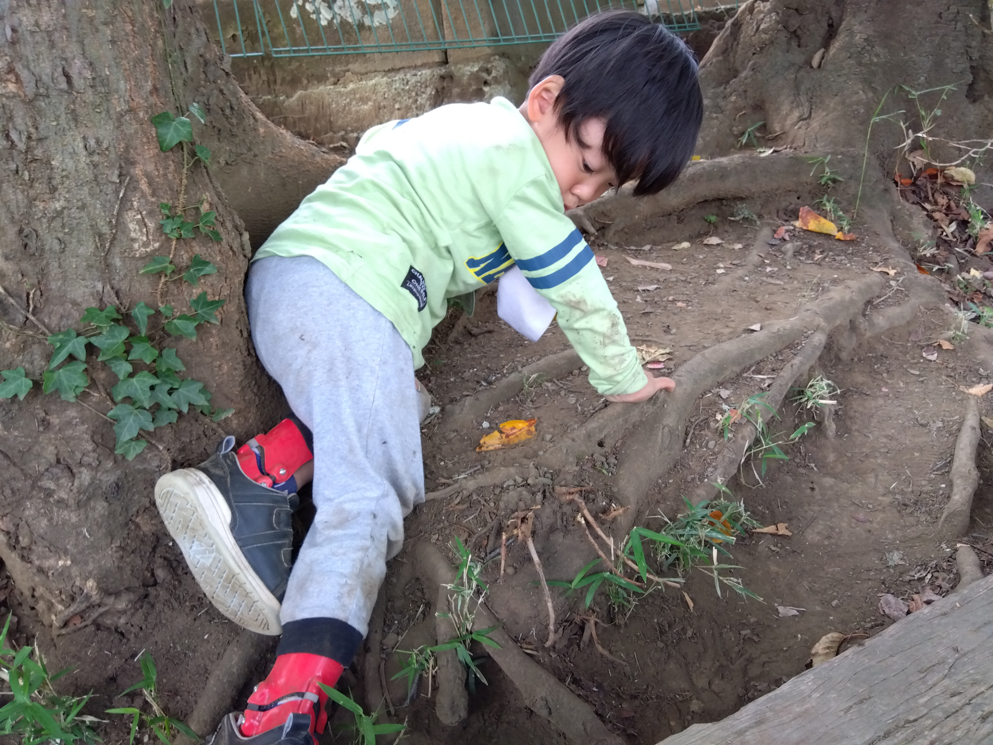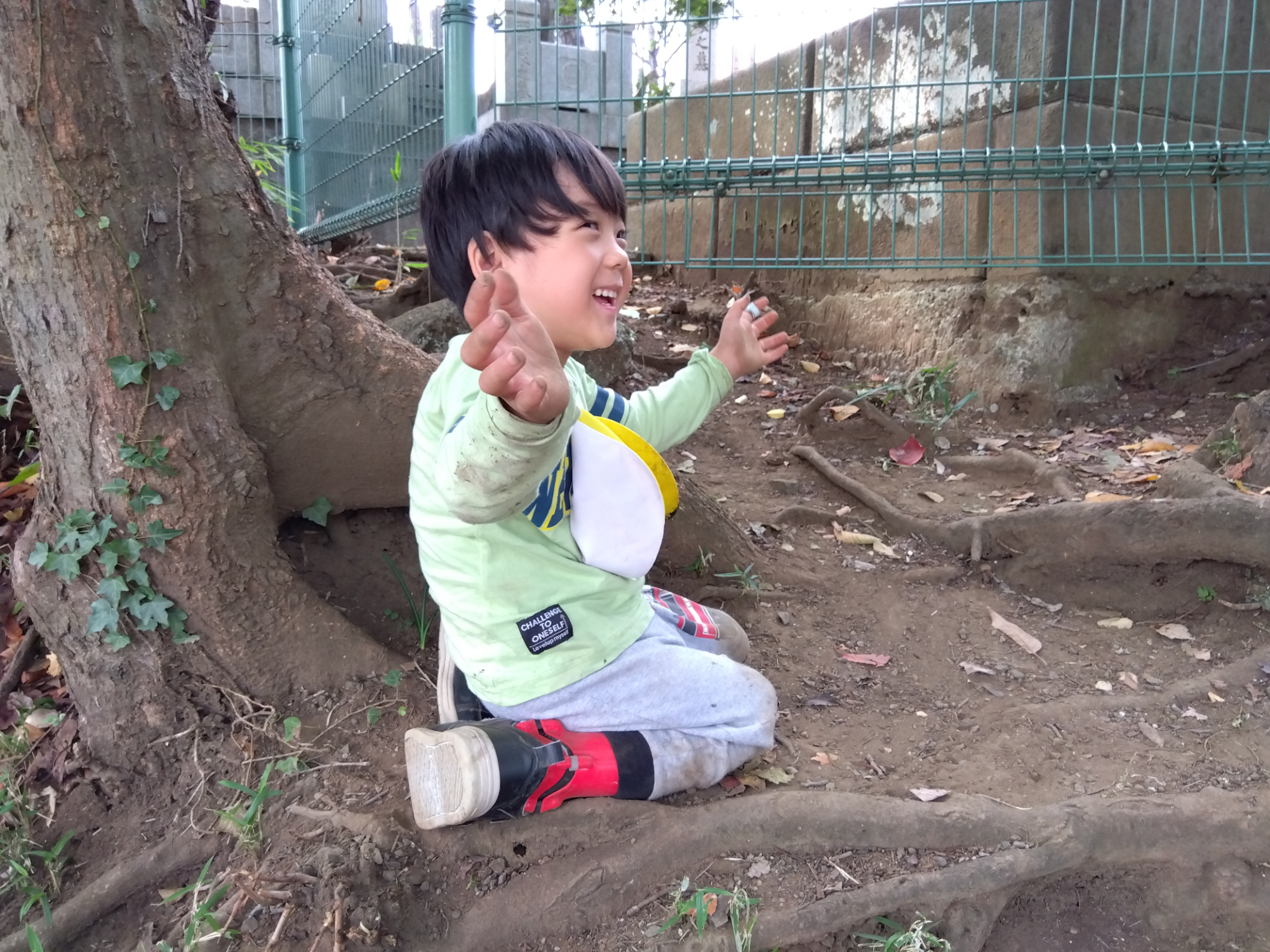 二つ目は、「ねこじゃらし公園」です。かなり遠くまで歩かなければいけませんが、ワクワクが詰まったとても魅力的な遊び場です。斜面の多い公園内には大きな木の根っこがそこら中にむき出しになっており、自然のアスレチックのようになっています。急斜面を前にしても、子どもは全く怯む様子を見せません。どうやって登ろうか、どこまで行けるのか、好奇心に満ちた目はとてもキラキラしています。