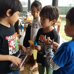 一つ目は、「水族館」です。紙皿や折り紙などを使って、子どもたちそれぞれがオリジナルの魚や、ちんあなご、クラゲなどを創りました。「どんな模様にしようかな?」「どんな顔を描こうかな?」と、想像力をめいっぱい使って考えます。友達の魚をのぞいたり、図鑑や絵本で見たものなどを思い出したりしながら、創る過程で子どもたちの感性がどんどん刺激され広がっていきます。模様の書き方、表情のつけ方などそれぞれの個性が際立っています。