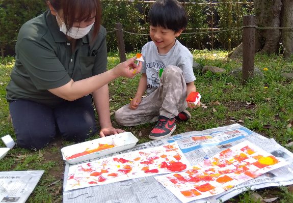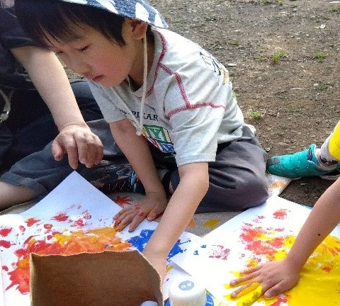 子どもの日といえば、やはり「こいのぼり」をイメージする方が多いのではないかと思います。つむぎでもこいのぼり作りに取り組んでみました。模造紙にスタンプをしてみたり、色のついた泡で模様を作るバブルアートの手法を使って模様をつけてみたり、子どもたちそれぞれの発想で自由にこいのぼりをデザインしました。