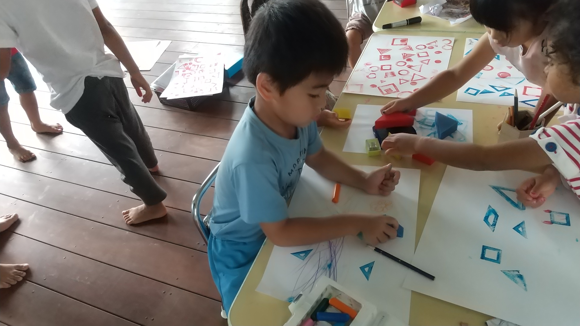 雨の日はテラスにて併設の前原どろんこ保育園の子どもたちとスタンプ遊びをしました。クレヨンを手に塗り遊んでいると、友達が絵の具をつけたスタンプを紙に押し付けて色が着くことを教えてくれ、鮮やかな作品ができあがりました。